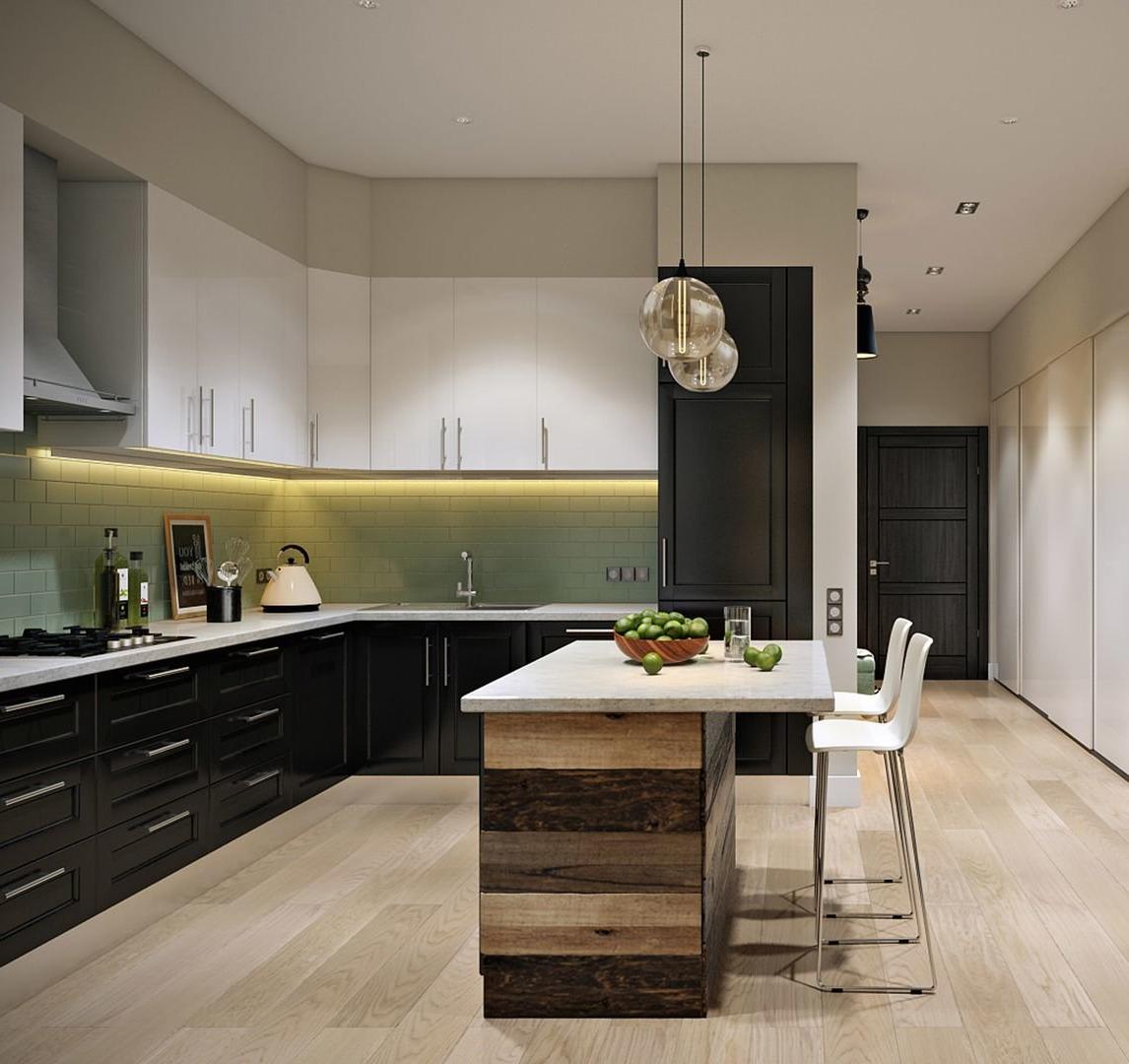 | Цвет | Для кухонной зоны в актуальном дизайне уместна как светлая гамма (белый, бежевый, серый, голубой и т.п.), так и темные тона (коричневый, графитовый). Часто главным приемом является контраст двух основных цветов с подключением яркого акцента в виде стульев, отделки стены, броского фартука, посуды, текстильных элементов. |