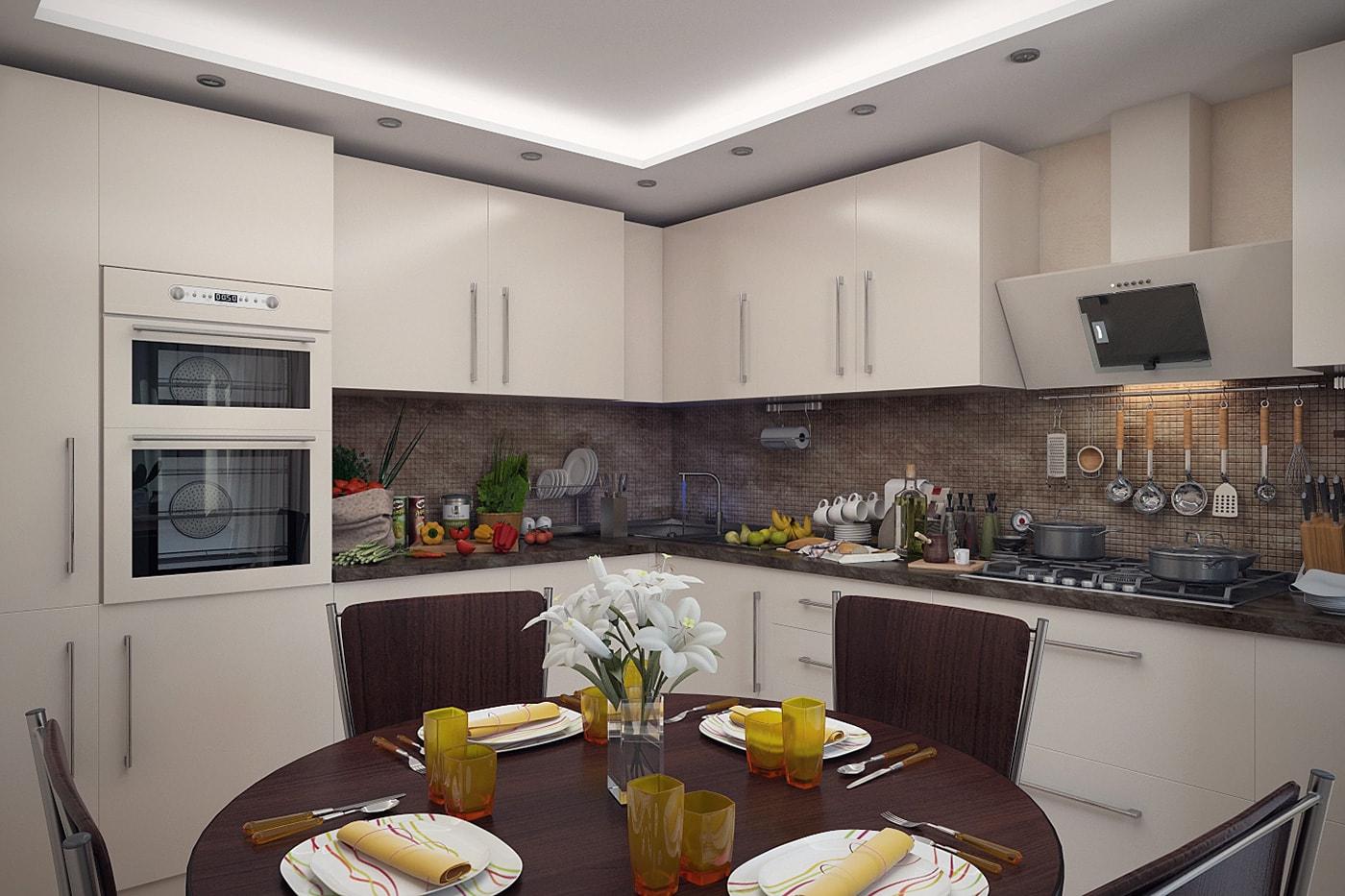 Для оформления кухни характерна внешняя лаконичность, рабочие зоны удобны и просторны, каждый квадратный сантиметр функционален. Обеденная зона тоже обустраивается максимально эргономично.