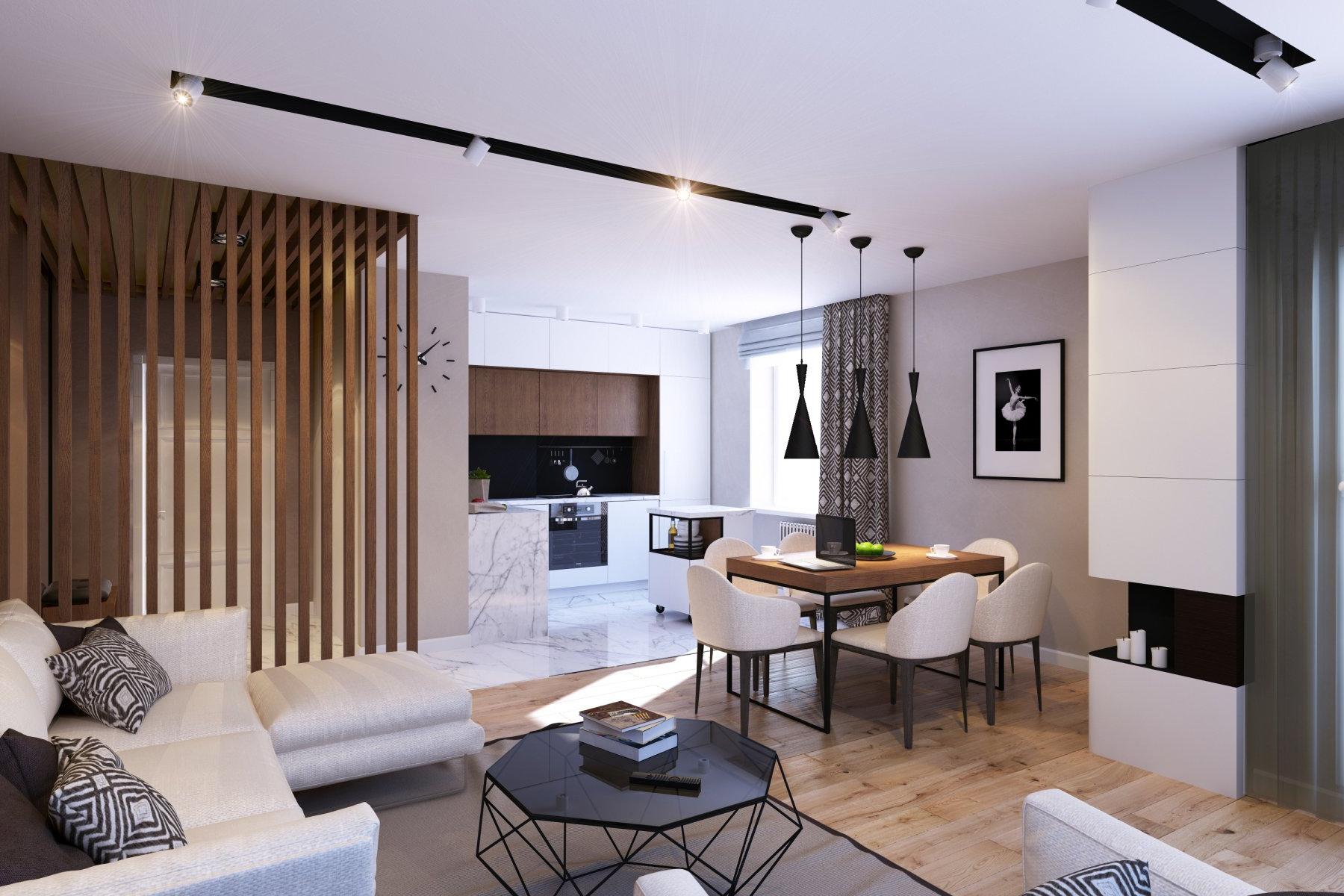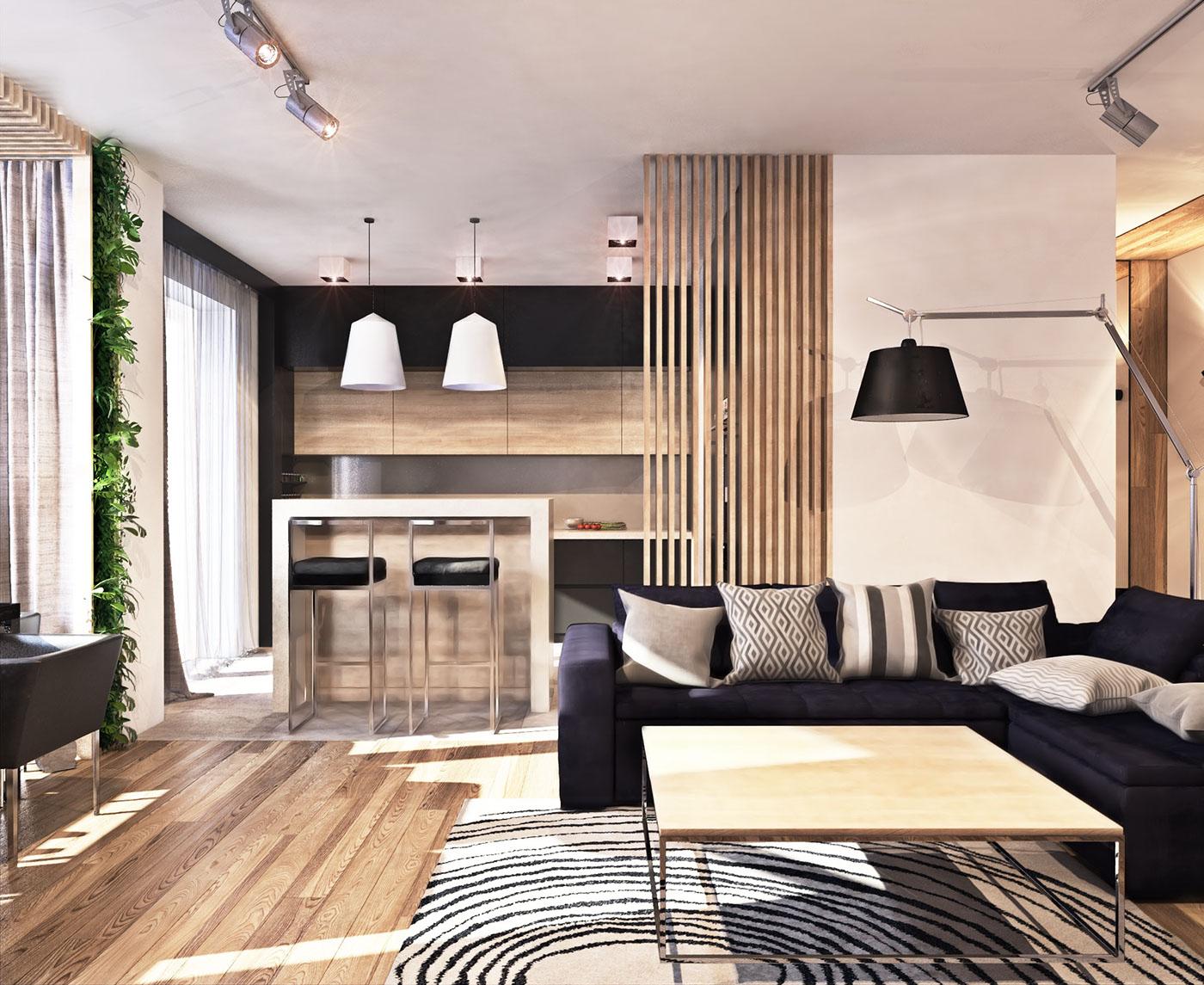 Интерьер кухни-гостиной, выполненный в современном стиле, отвечает одному из главных принципов направления – сохранить пространство открытым. Благодаря одинаковым приемам в дизайне пола, потолка, стен усиливается эффект зрительной цельности обеих зон. Смысловой границей выступают барная стойка, обеденный стол, диван, декоративная перегородка.