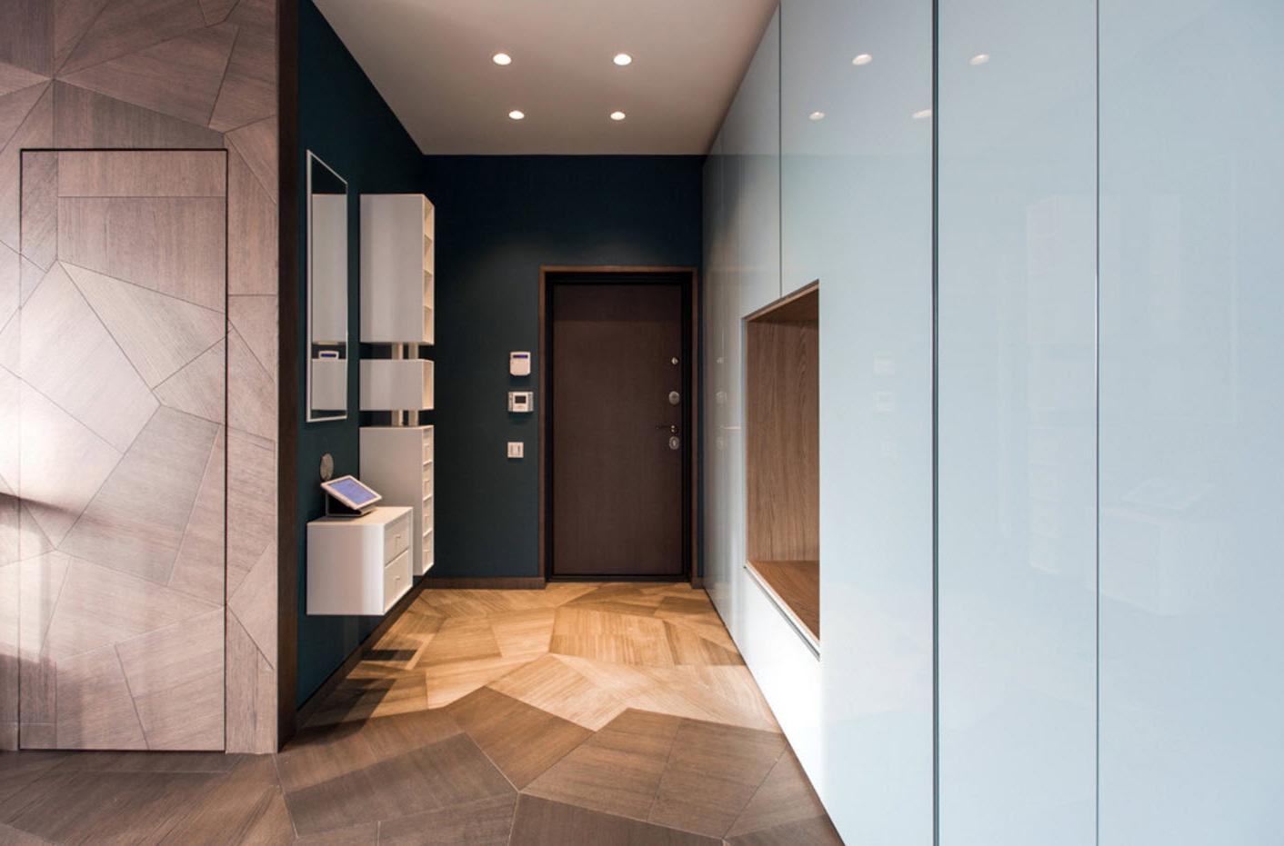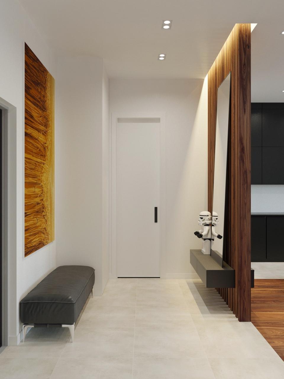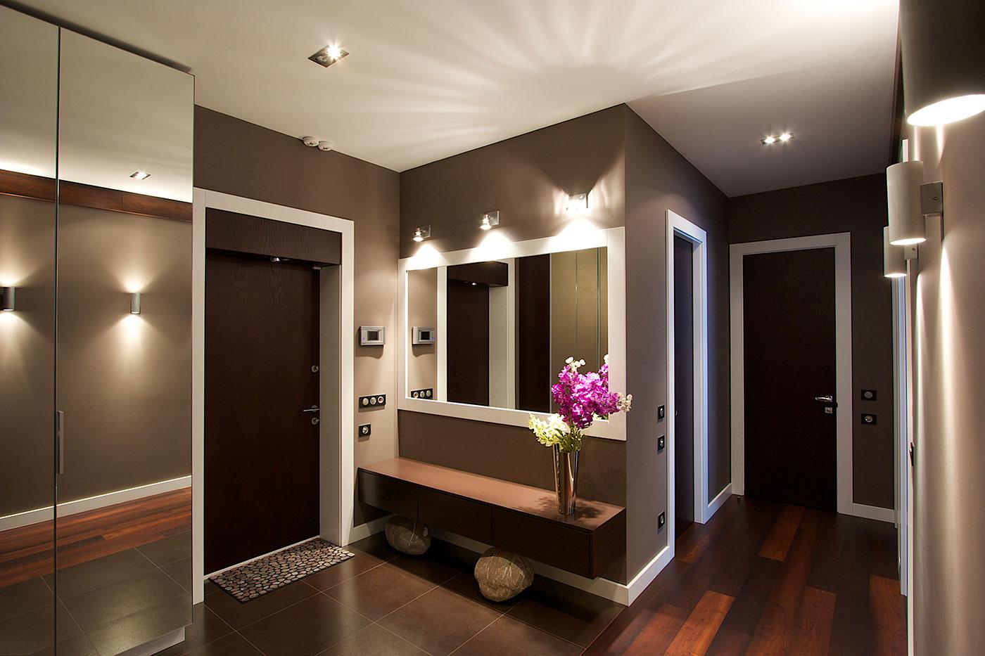 Аккуратность, смысловая и цветовая ясность интерьера прихожей с первых минут создает приятное впечатление о квартире в целом. Отделка, меблировка, оформление дверей в сочетании с теплой подсветкой легко воспринимаются единой композицией.