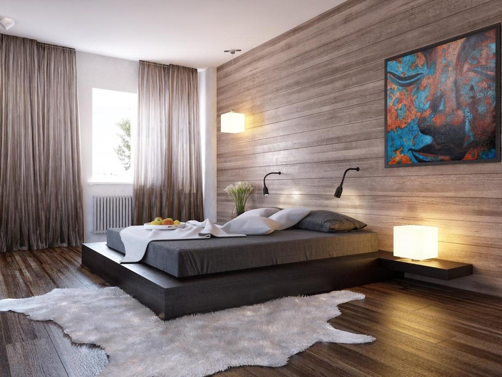 | Материалы | Покрытия должны быть экологичны. Основное внимание на текстуру: четкий узор древесины, фактурность декоративной штукатурки, матовые и глянцевые поверхности. Характерные материалы для пола – паркет, ламинат. Для стен – обои, покраска, деревянные панели, бетон, кирпичная кладка. Потолок самый минималистичный: гладкая белая плоскость с подвесными конструкциями для светильников. Частый прием в оформлении спальни – комбинирование покрытий. |
