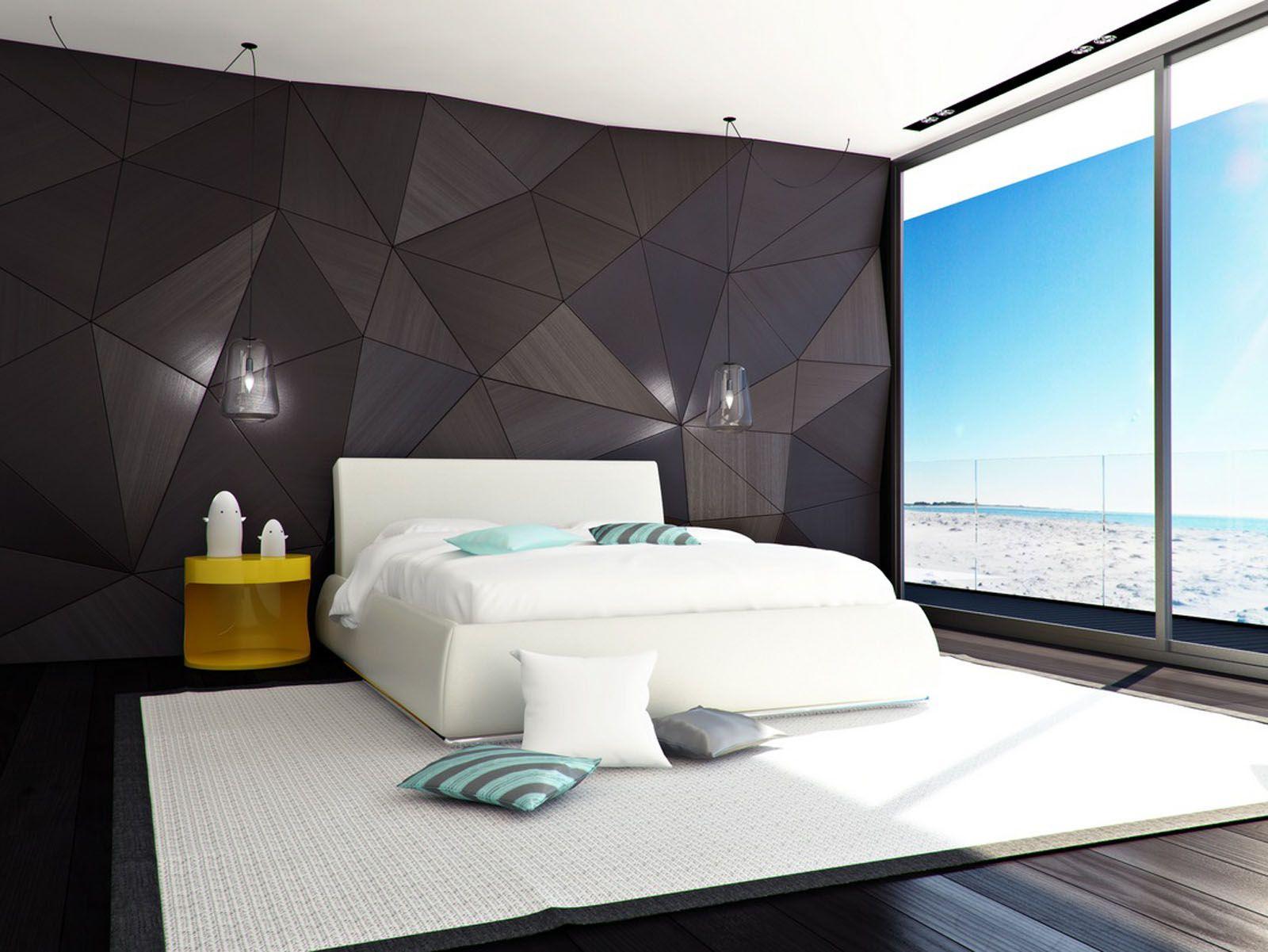 | Аксессуары и декор | Приемы для оформления зоны изголовья – рельефные панно, кожаная стегая панель, подсвеченная ниша с жалюзи. Приставленные к стене напольные зеркала добавят помещению объема. |