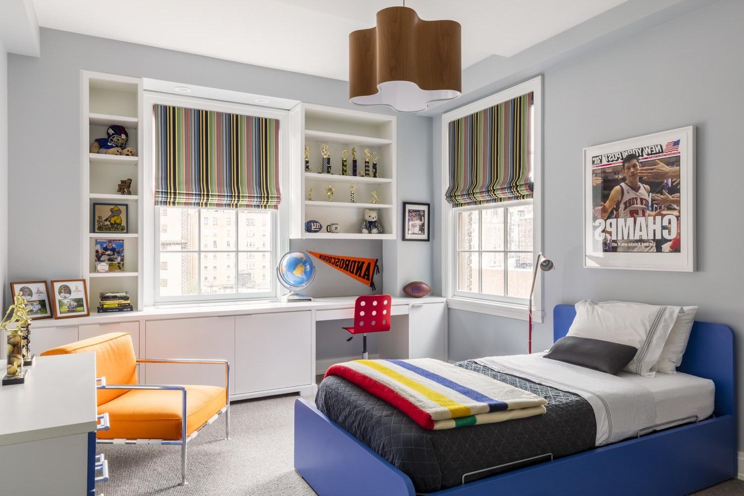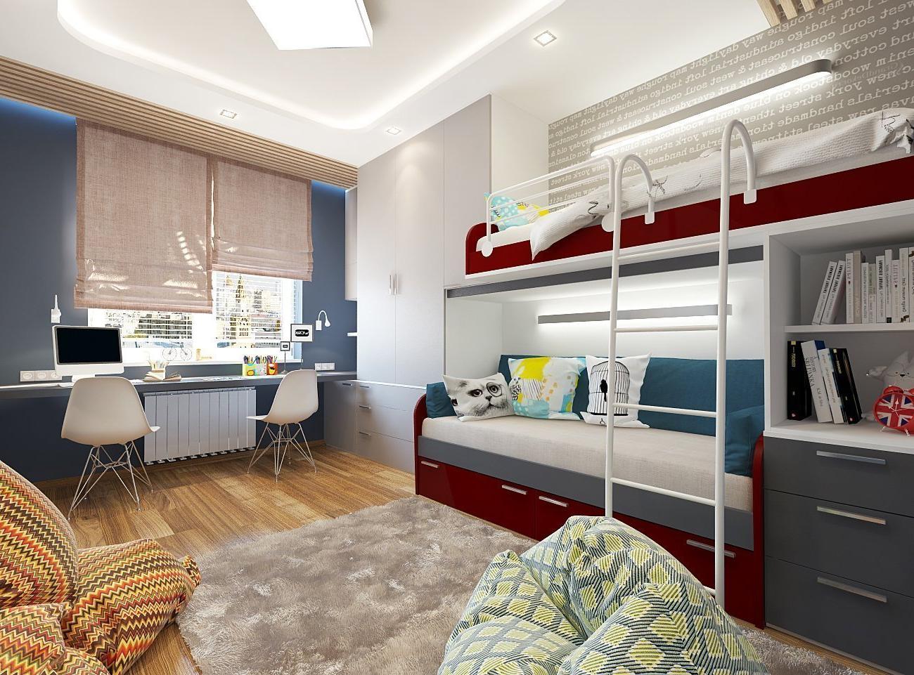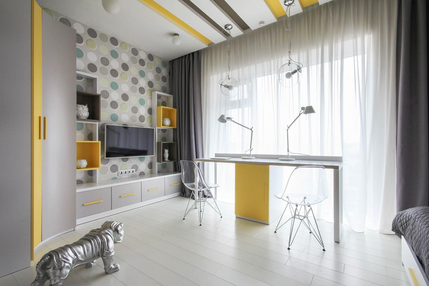 Обязательно многоуровневое освещение: в активное время суток будет доступна любая зона комнаты (рабочая, игровая), перед сном понадобится мягкий расслабляющий свет. С задачей справятся центральная люстра, точечные источники по периметру, настольные лампы, бра в зоне кровати. |