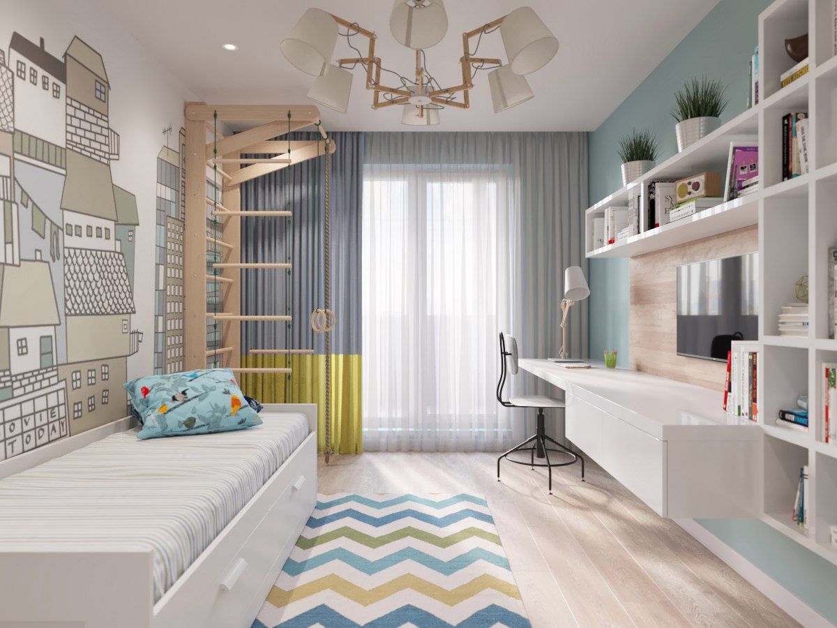 Оформление детской комнаты в актуальном дизайне подходит ребенку любого возраста, т.к. во главу угла здесь ставится не украшение кружевами и цветами (в случае девичьей спальни) и не пестрый декор на тему мультфильмов (для мальчиков), а комфорт проживания юного хозяина.