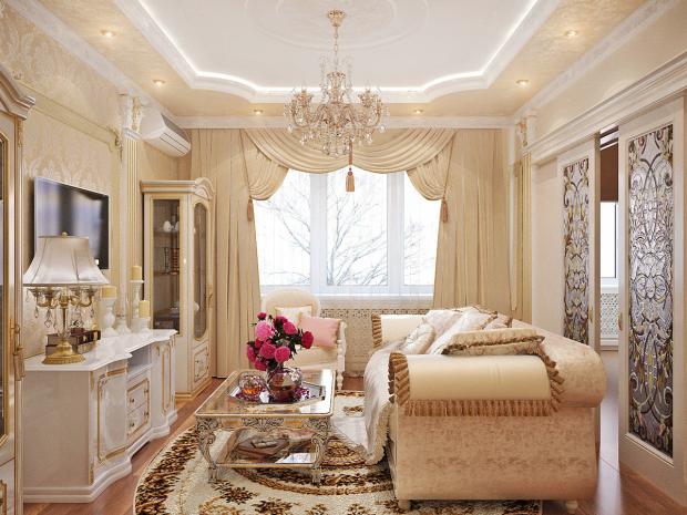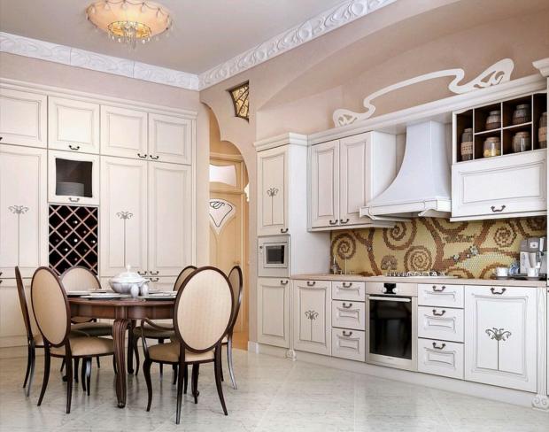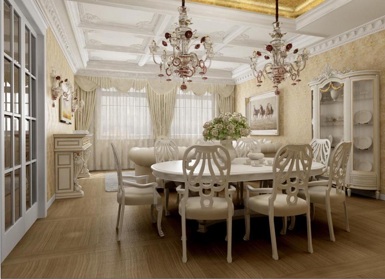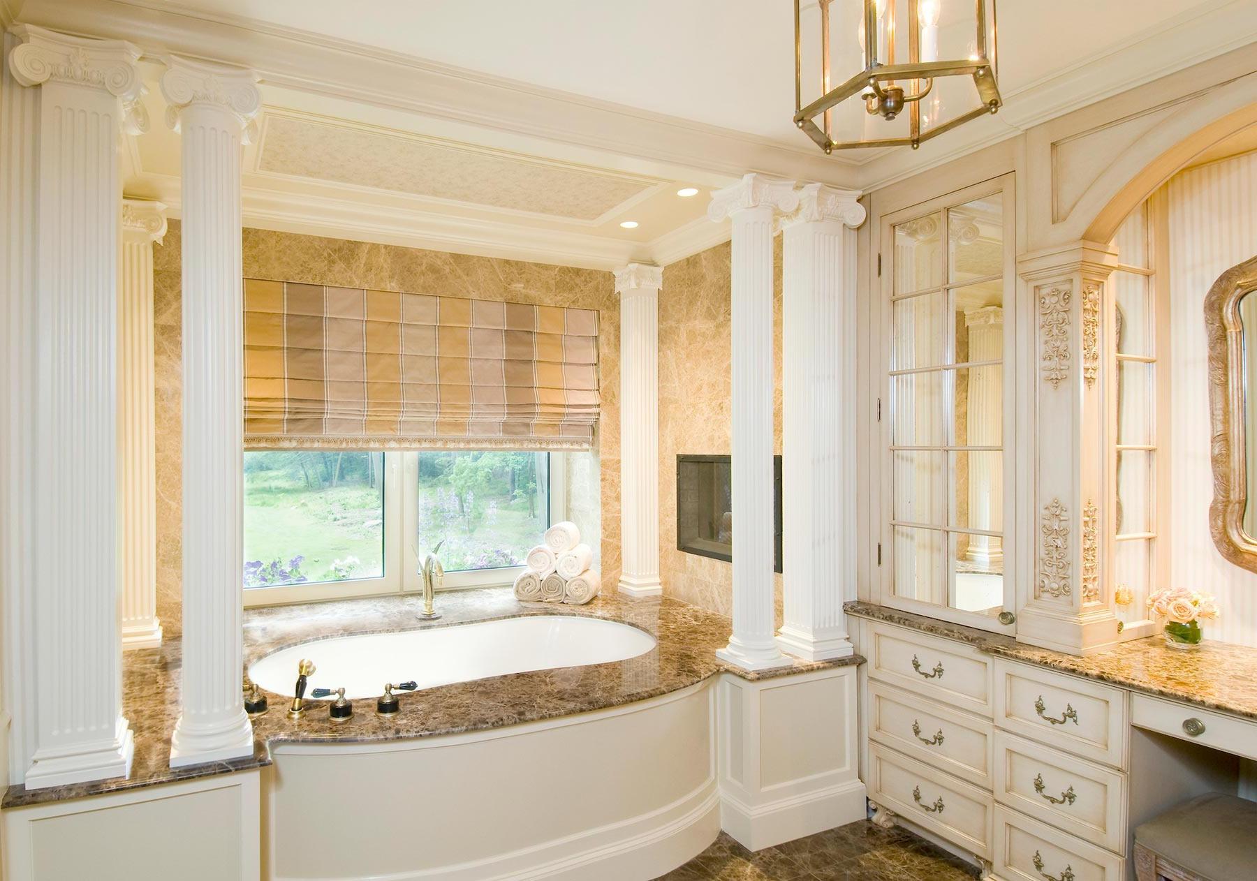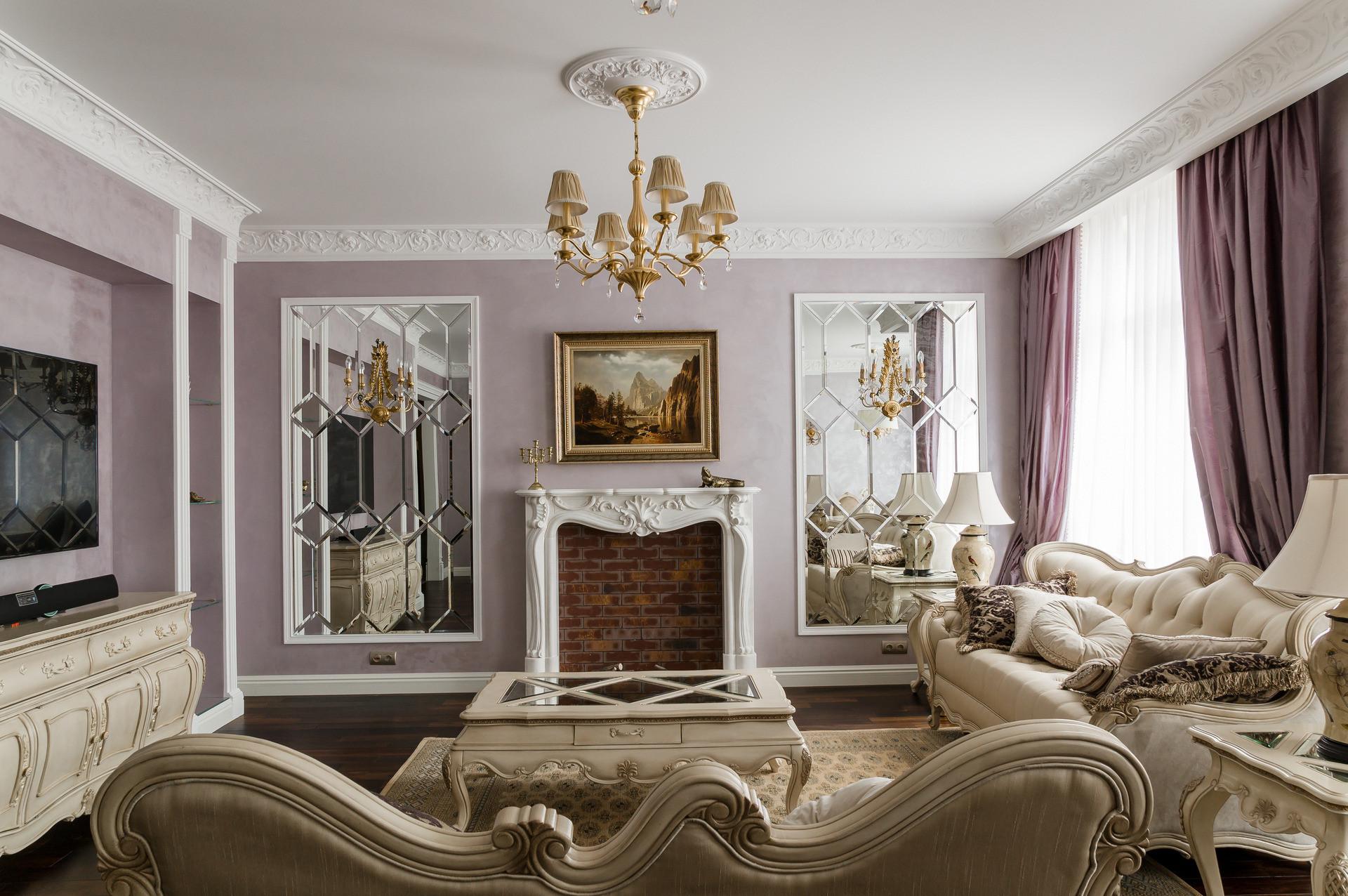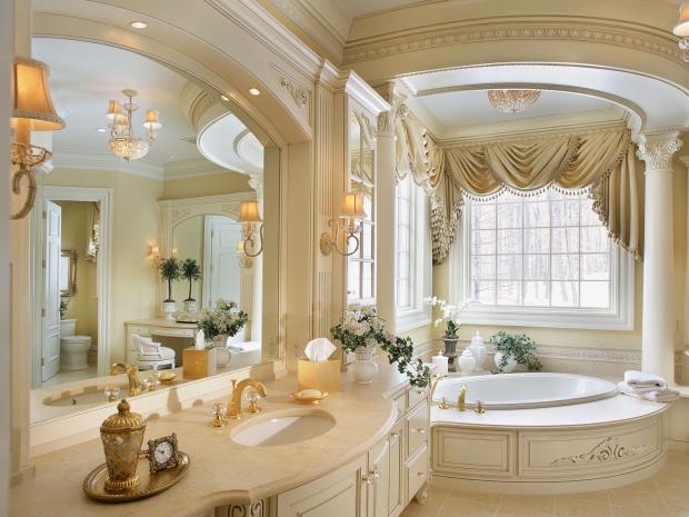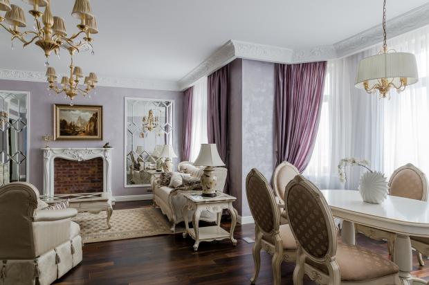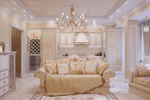 В сочетании с зеркалами это зрительно увеличит маленькое помещение. В больших комнатах жемчужная, песочная, ванильная палитра усилит эффект открытости. - С помощью пилястр, молдингов, резных карнизов можно акцентировать внимание на функциональные зоны.