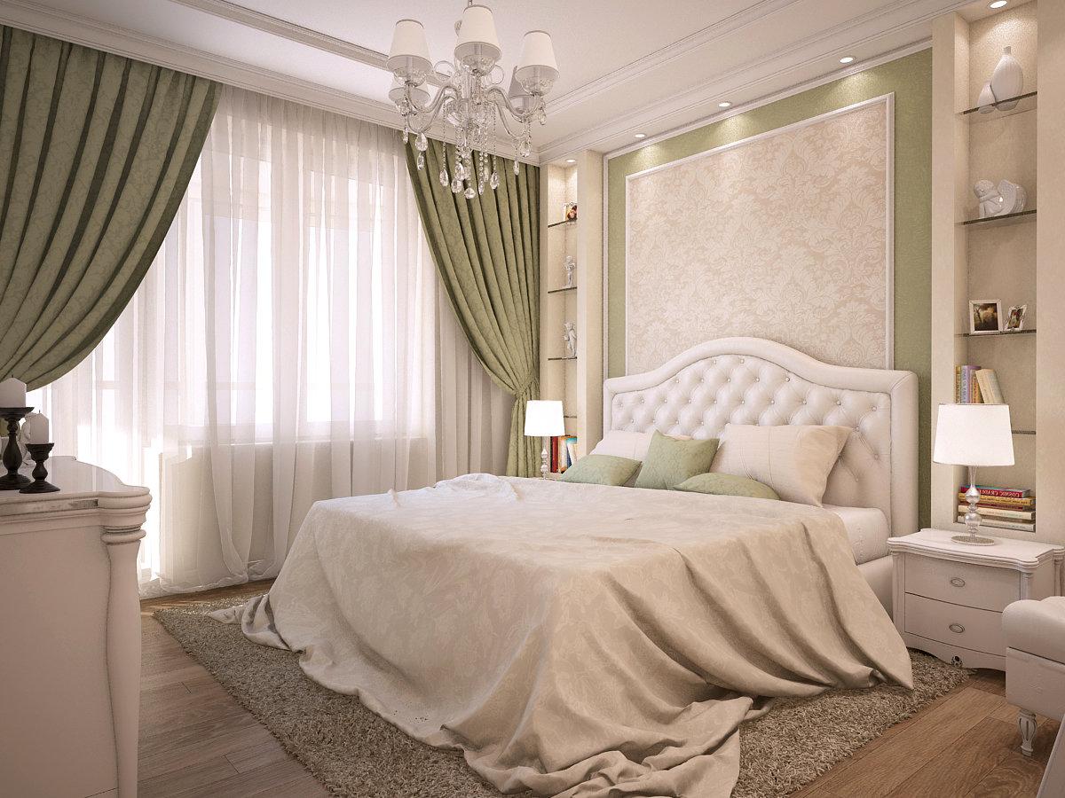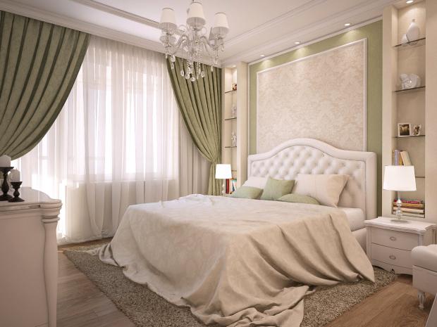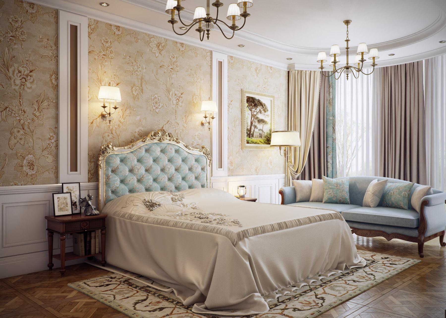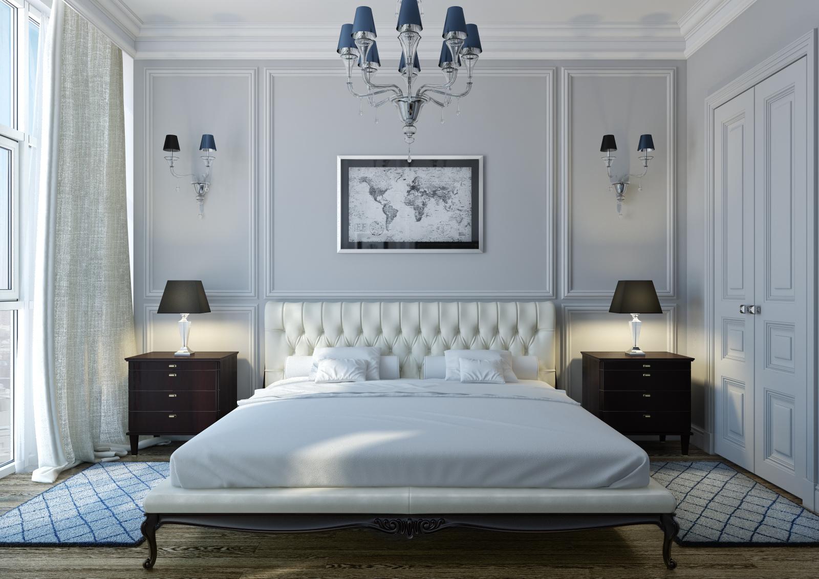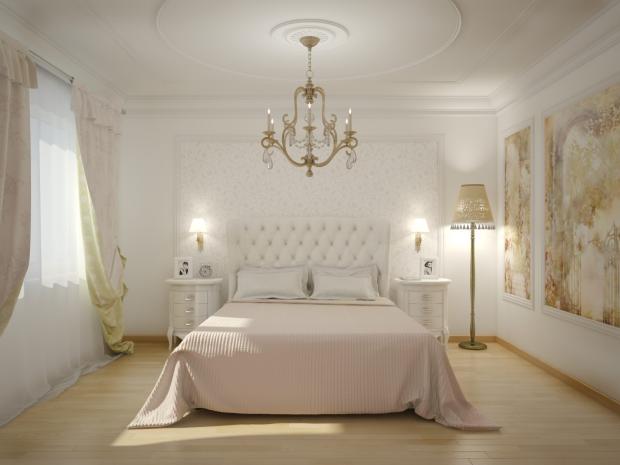 Ее оформляют красивыми обоями и обрамляют пилястрами, симметричной композицией молдингов (в центральной части – картина, зеркало, по бокам – парные светильники). - В комнате настраивают два сценария освещения: главный источник – люстра, для более уютного местного свечения включают бра или настольные лампы.