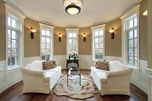Использование лепнины зависит от размеров комнаты. На небольшой площади лучше ограничиться аккуратными настенными молдингами, расположенными симметрично. Если их выкрасить в тон стены, возникнет эффект дорогих облицовочных панелей.