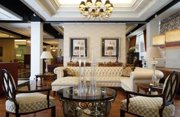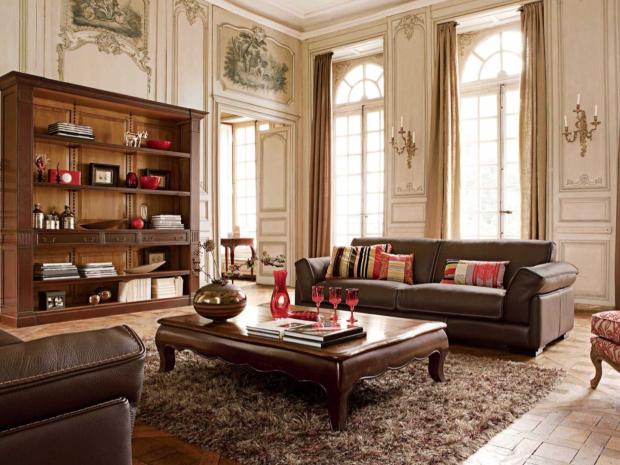 Мебель в традиционном стиле должна быть элегантной, красивой, но в первую очередь, комфортной. Отсюда предпочтение большим мягким диванам, глубоким креслам с закругленными краями, обивке из натуральных материалов. Очень красиво смотрится кожаная отделка в окружении лакированных поверхностей деревянных столов, шкафов. Допускаются изящные резные накладки и вставки позолоты.