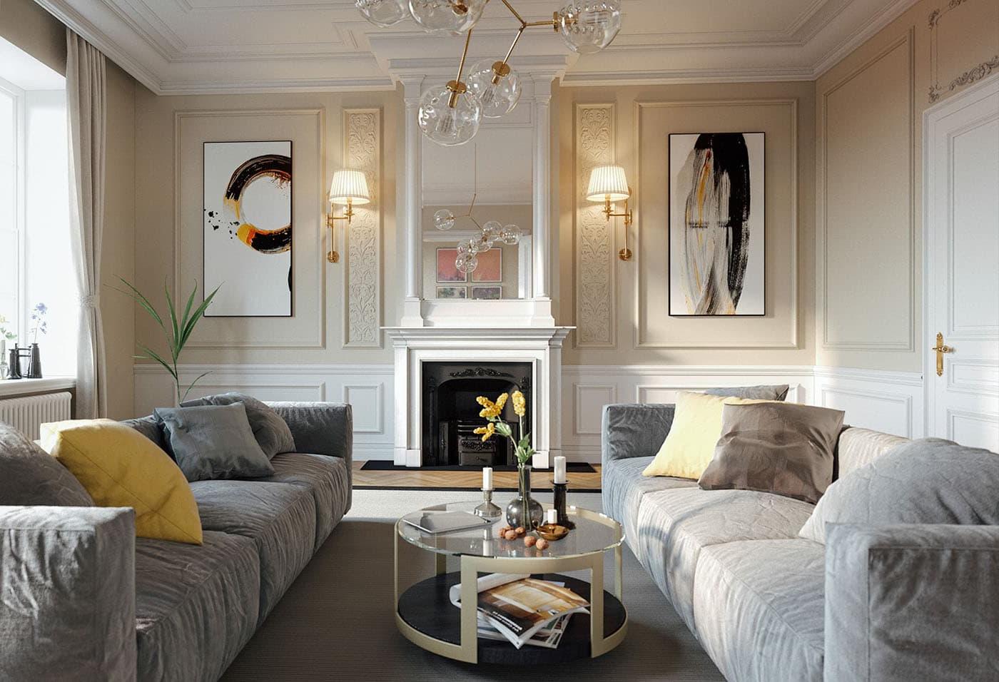 Современная классика родилась из античности и заимствовала оттуда любовь к симметричности и пропорциональности. Мебельные и декоративные ансамбли размещают вокруг композиционных центров – камина, обеденного стола, дивана. И если по центру композиции провести линию, предметы по обе стороны зеркально повторят друг друга. Поэтому нужны парные кресла, парные вазы, столики и т.п.