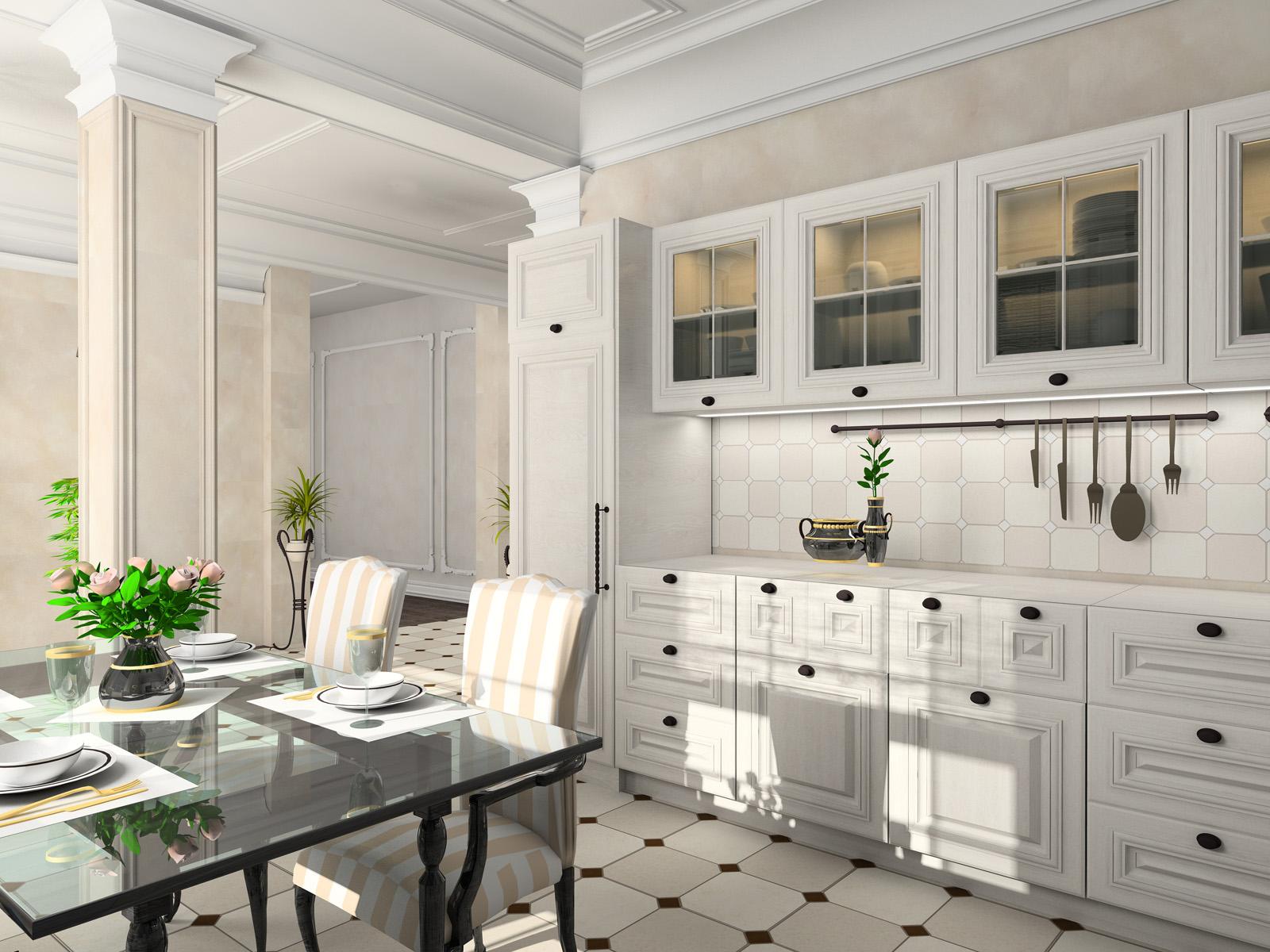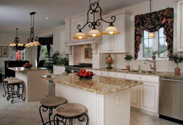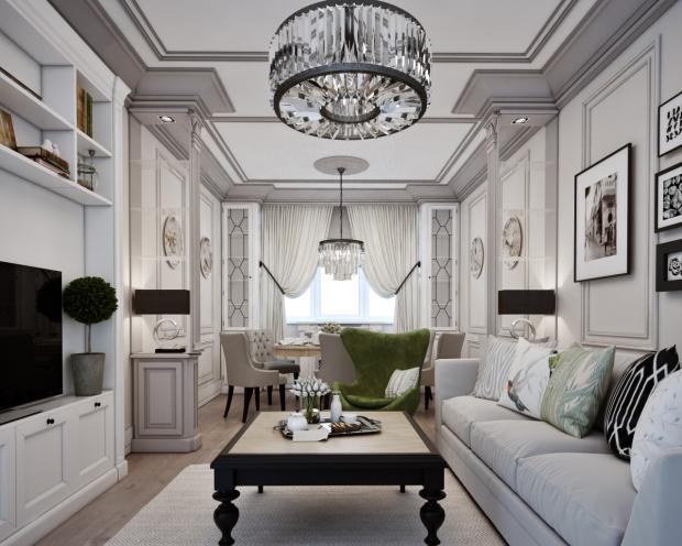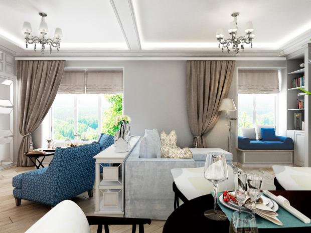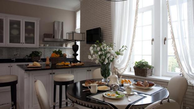 В случае объединения с гостиной в ход идут общие для обеих зон декораторские приемы: оформление карнизами, близкая цветовая гамма, однотипные источники освещения. - Задача отделки – выдержать внешнюю каноническую стилизацию и реализовать современную функциональность.
