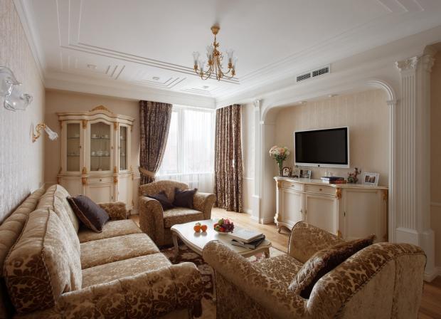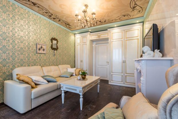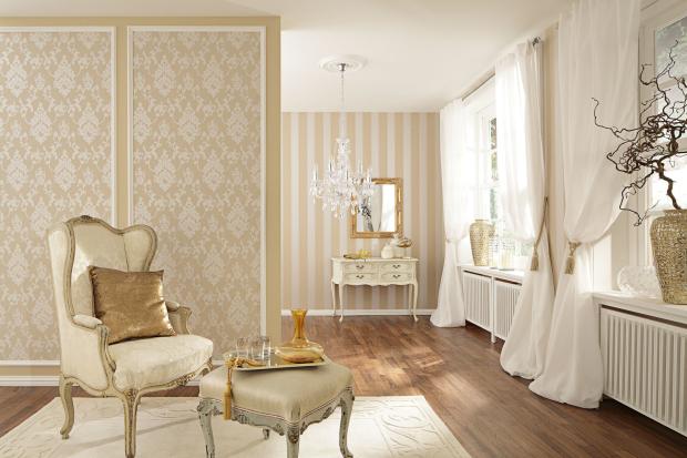 Обивку кресел и диванов можно выделить более ярко. - Стены оформлены орнаментальными обоями, белой лепниной.