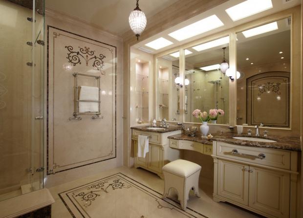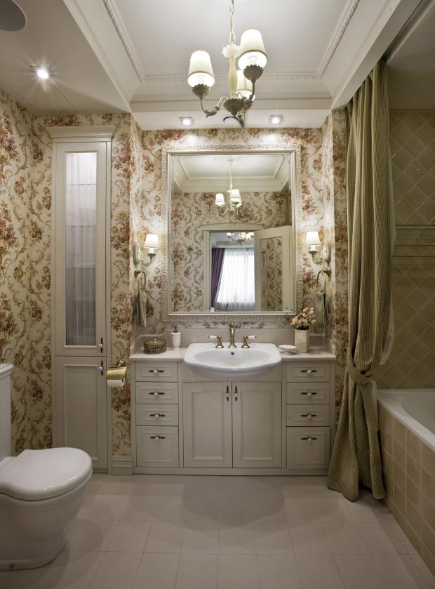 Вариант оформления – плитка с цветочными мотивами, как на обоях. - Шкафы, тумба под умывальник имеют фасады с филенками, резными элементами. Столешницы выполнены из мрамора.