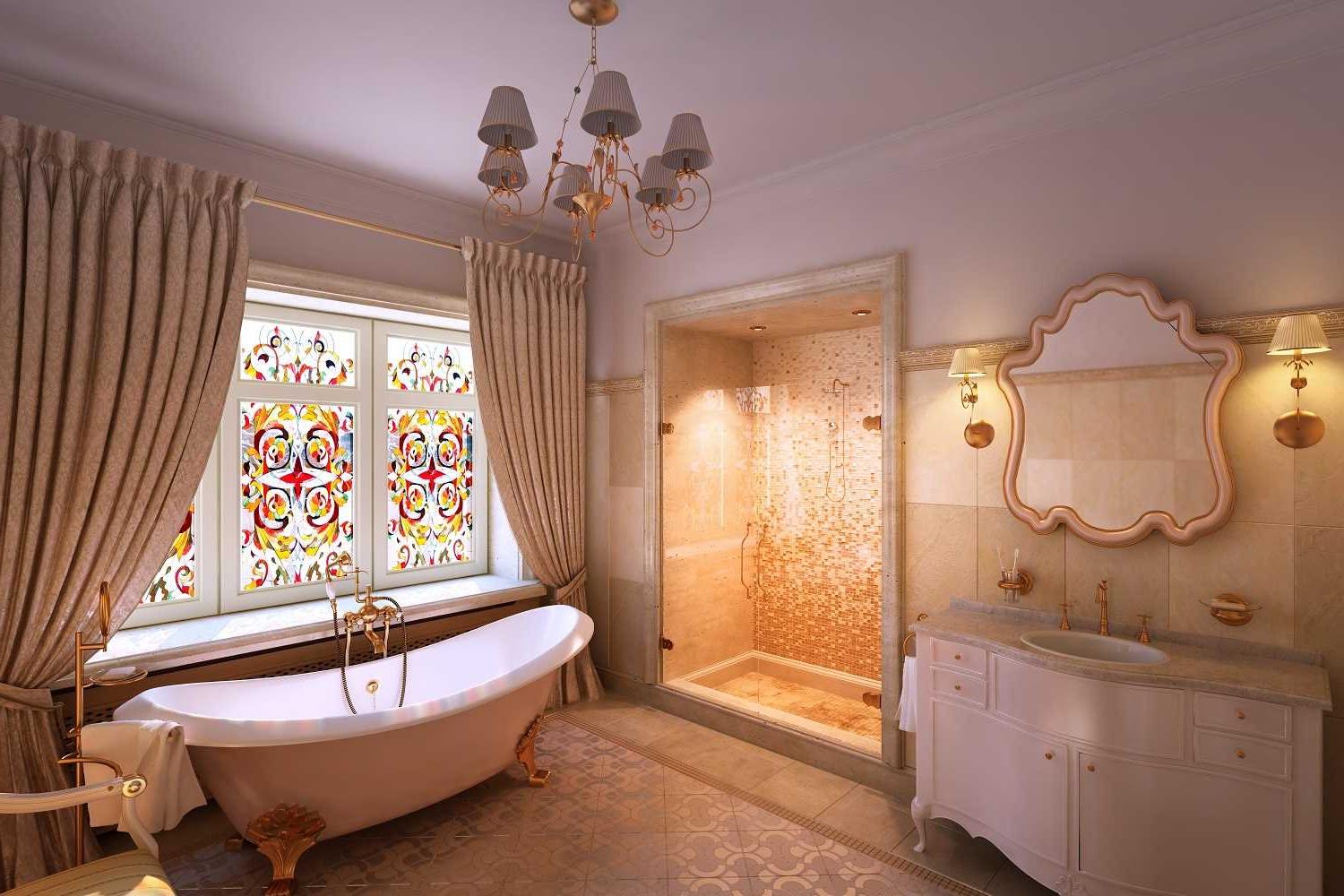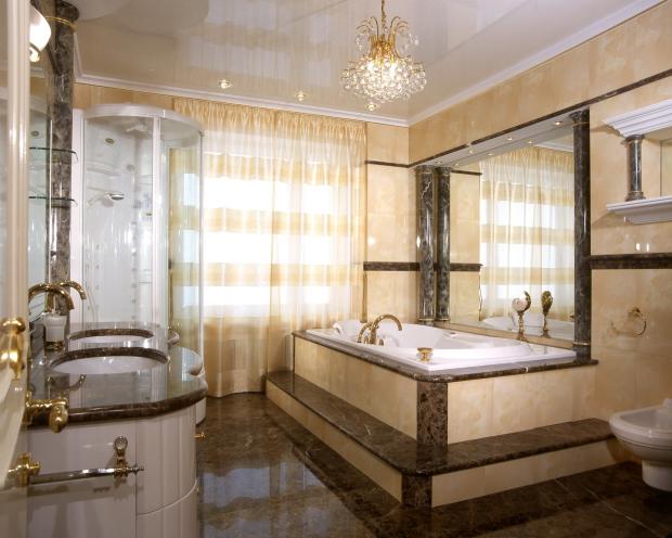 Если есть окно – гардины обязательны. Не хочется вешать солидные портьеры, можно обойтись аккуратными римскими шторами. - Отделочные материалы для стен и пола – натуральный камень, керамическая плитка с имитацией природных материалов (мрамора, гранита).
