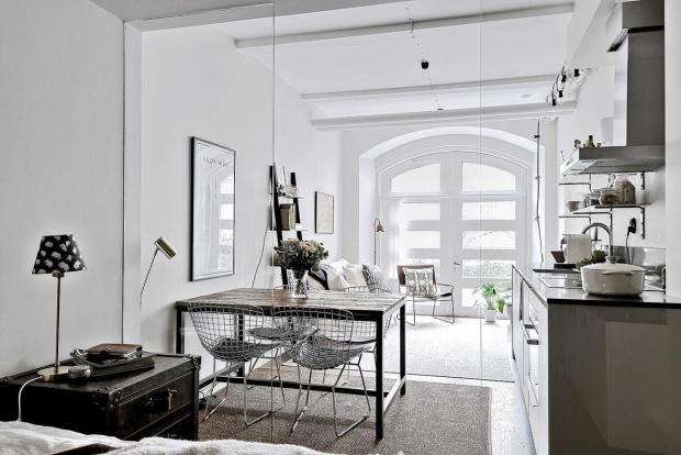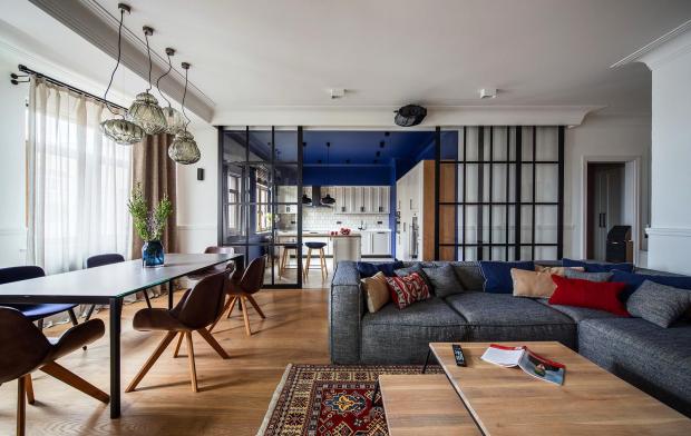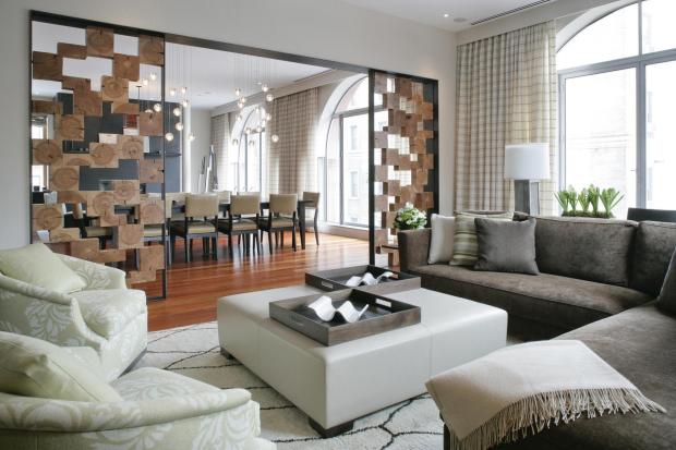 Раздвижные перегородки занимают мало места и также могут изолировать пространство, что удобно с точки зрения функциональности: если вы будете готовить рыбу в зоне кухни, запах не уйдет в жилые помещения. А для приема гостей можно раскрыть перегородки, увеличивая пространство. Несмотря на то, что раздвижные перегородки монтируются по окончанию ремонта, укреплять подвесные потолки необходимо заранее.