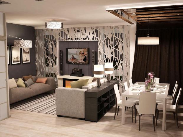 Открытая планировка квартиры может быть разграничена с помощью мебели. Развернуть диван спинкой по отношению к кухне, или поставить на границе кухни-столовой и гостиной барную стойку, подыскать эффектные дизайнерские стеллажи-стойки – самые распространенные приемы в зонировании пространства.