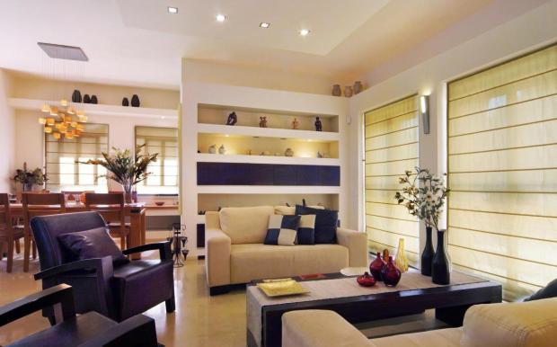 Существует два варианта зонирования с помощью перегородок: стены до потолка со сквозными нишами или встроенным крупным декором, например, в виде аквариума или переходящие в колонны. Второй тип – конструкции средней высоты, ниже человеческого роста, иногда ступенчатой формы. При желании на их горизонтальной поверхности можно расположить композиции из растений или мелкую пластику.