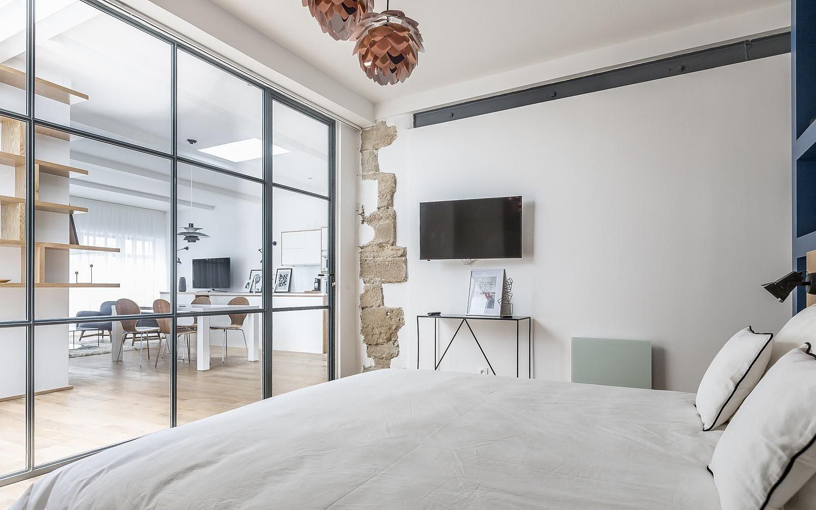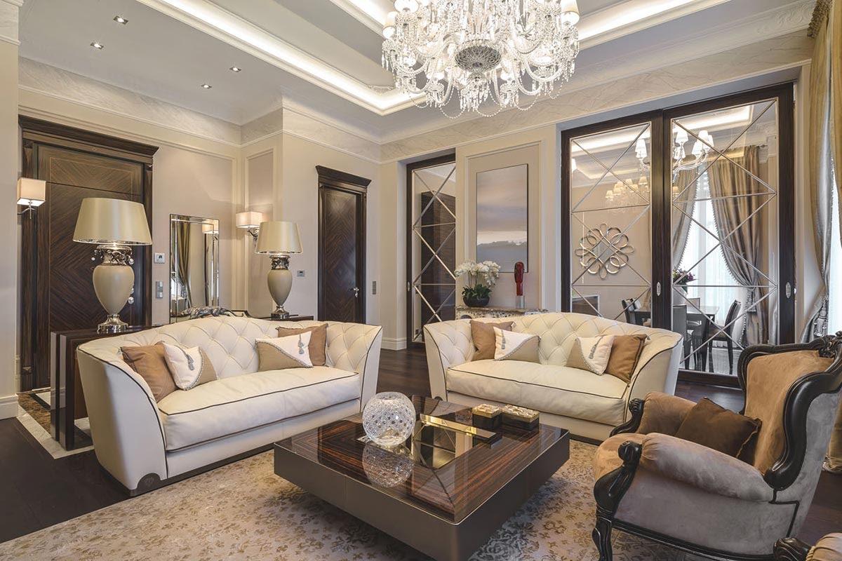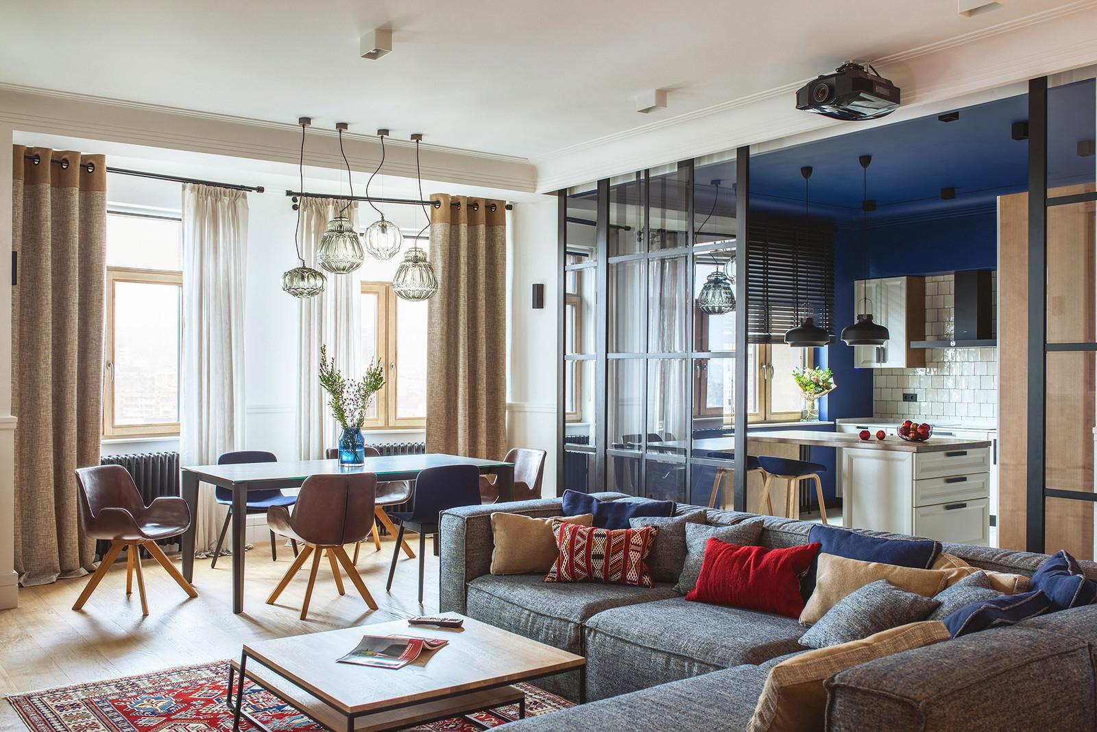Метод открытой планировки объединяет территорию для семейного отдыха, приема гостей, дневных забот в одно просторное помещение, а приватная часть квартиры – спальни, санузлы, гардероб и кабинет изолированы.
