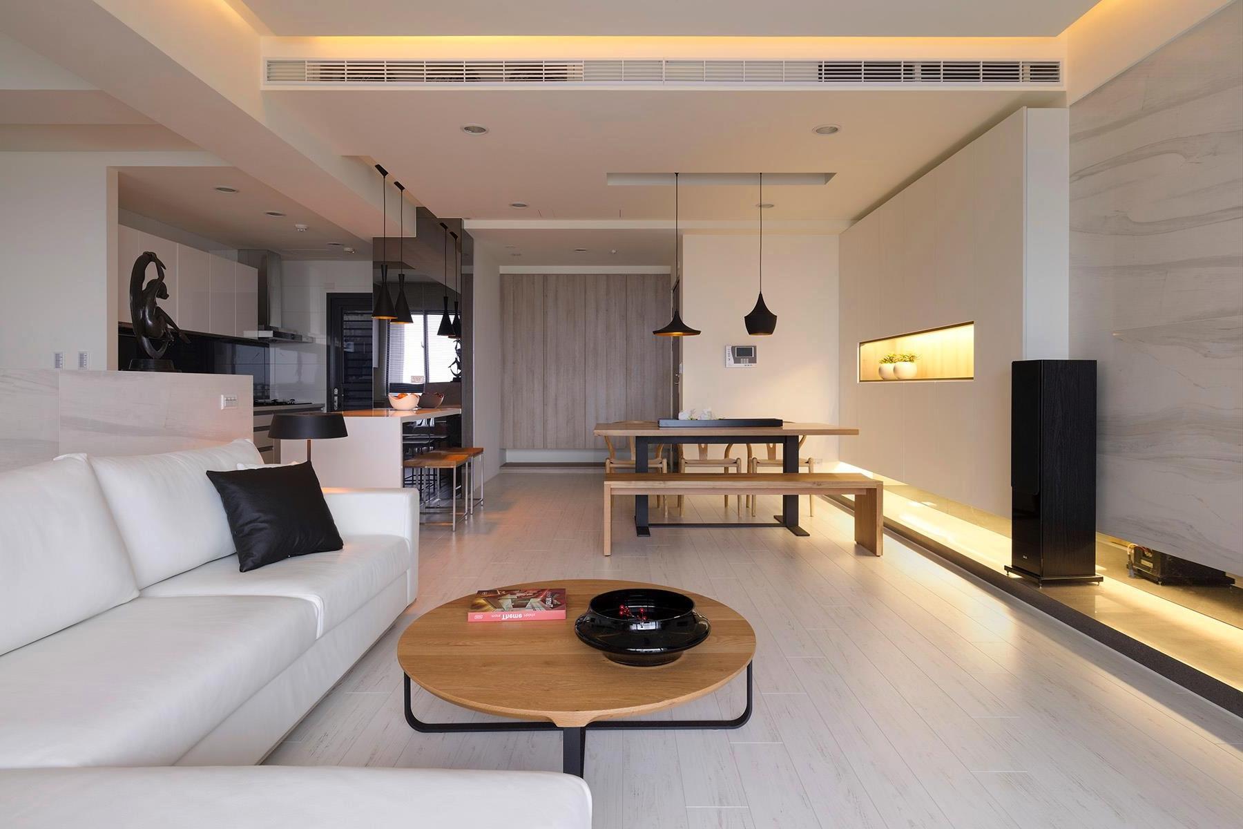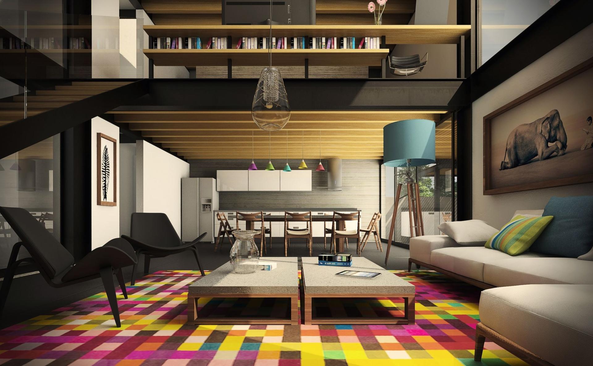Зонирование в интерьере квартиры с открытой планировкой можно организовать с помощью «метода разных уровней» – потолка и пола. Для этого необходимо соорудить многоуровневый потолок и/или подиум, в зависимости от вкуса и в соответствии с размерами зон.