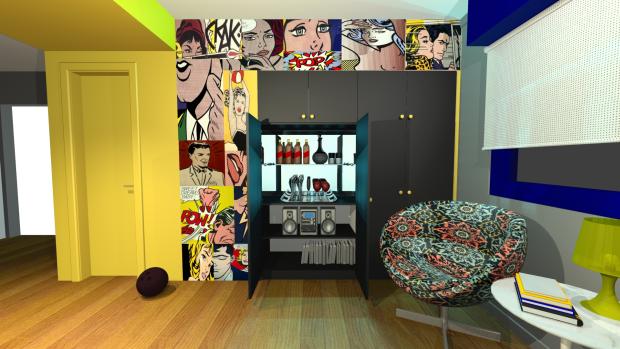 Так как поп-арт предусматривает яркие цвета, постеры, яркий декор, он нравится многим детям. Однако при обустройстве детской комнаты, нужно учитывать темперамент своего ребенка. Оптимальный вариант – сангвиники с незначительными задатками холерика. У детей с холерическим темпераментом буйство красок может вызывать повышенную активность, и даже раздражительность. Психологическое состояние флегматиков и меланхоликов обстановка поп-арт может перегружать. Такие же нюансы нужно учитывать и взрослым, однако у детей взаимосвязь обстановки и эмоционального состояния проявляется более выражено.