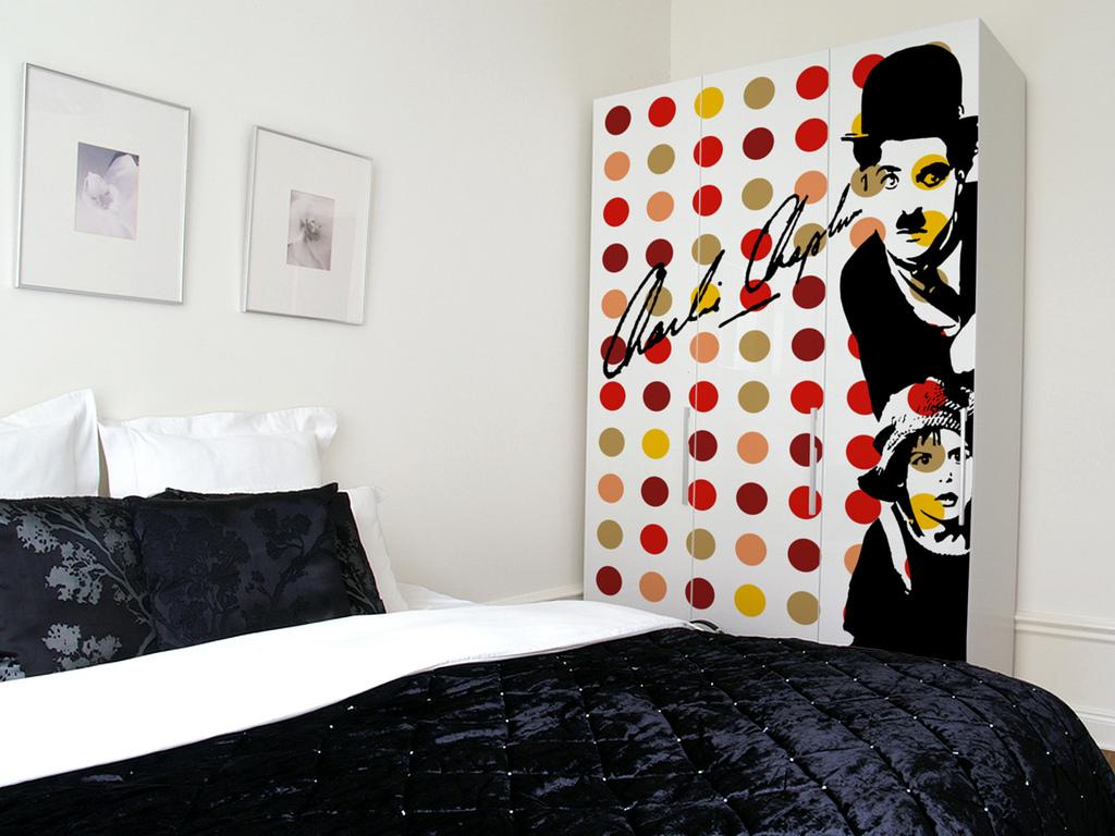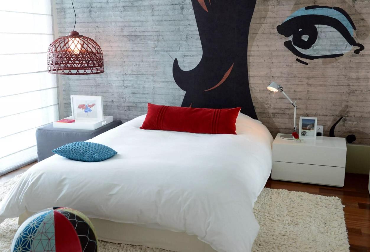 - Присутствуют постеры, афиши, портреты звезд, комиксы. Изображения находят свое место не только на стенах, но и на постельных комплектах, предметах быта, декора.