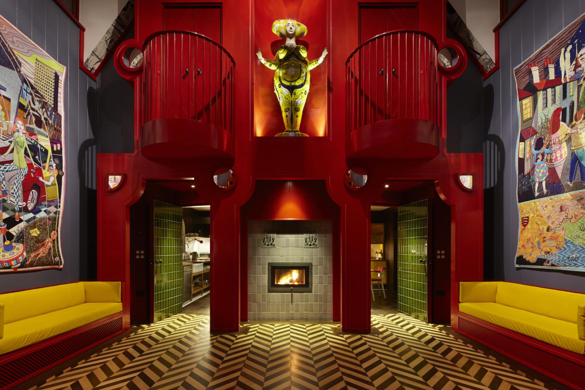 - На стенах эффектно смотрятся обои с притягательной оптической иллюзией или изображениями, которые меняются в зависимости от выбранного угла обзора. Также вертикальные поверхности покрываются декоративной штукатуркой яркого цвета, красятся, оклеиваются обоями. Иногда обои (штукатурку, краски) используют однотонные, особенно, если на стенах предусмотрены многочисленные композиции из декора. Используют и цикличные композиции, когда один элемент (орнамент, узор) многократно дублируется. Стены обычно несут ключевую смысловую нагрузку и производят впечатление.