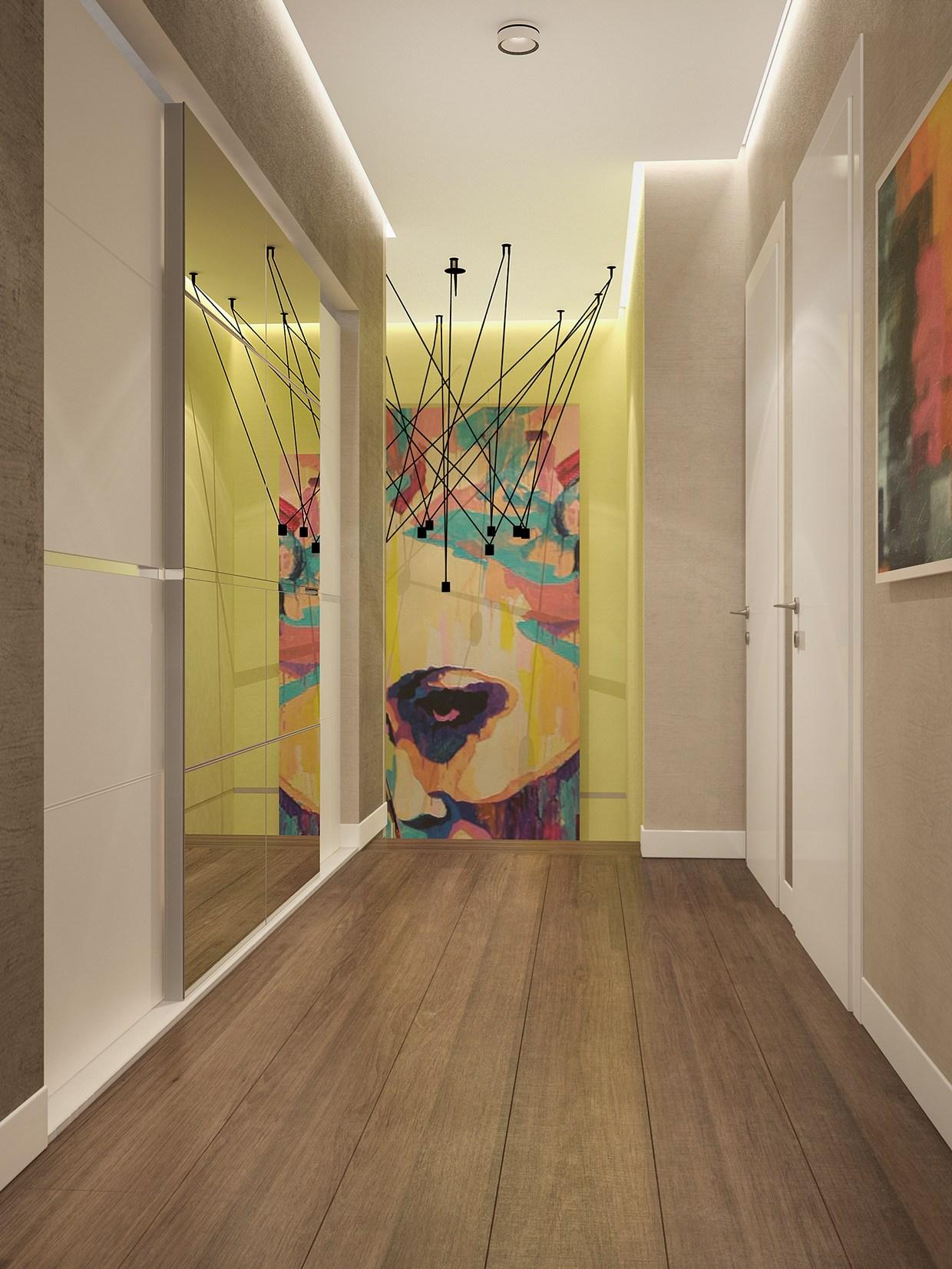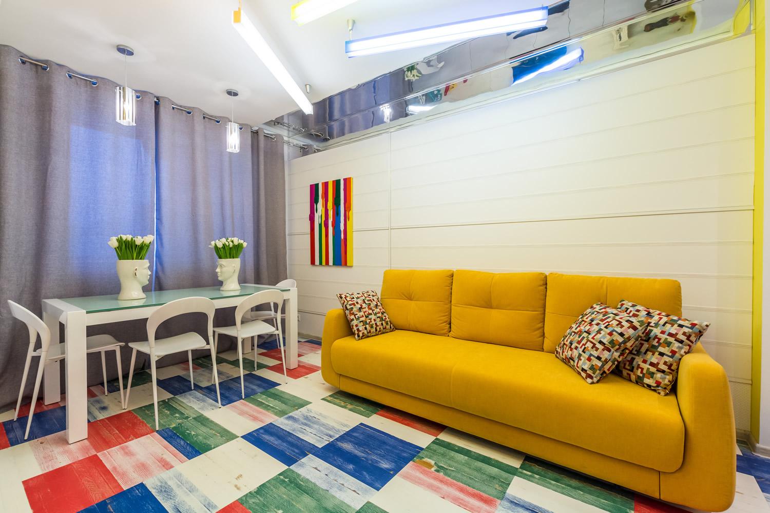 - Пол укладывают светлым ламинатом с эффектным глянцевым блеском в жилых комнатах. В помещениях с повышенной влажностью кладут плитку с выразительными цветовыми комбинациями или с преобладанием белого, разбавленного цветными вкраплениями. Еще один вариант – наливной пол. Он не только имеет красивый глянцевый блеск, но и позволяет нанести рисунок в стиле поп-арт. Иногда дизайнеры предлагают варианты пола с подиумом.