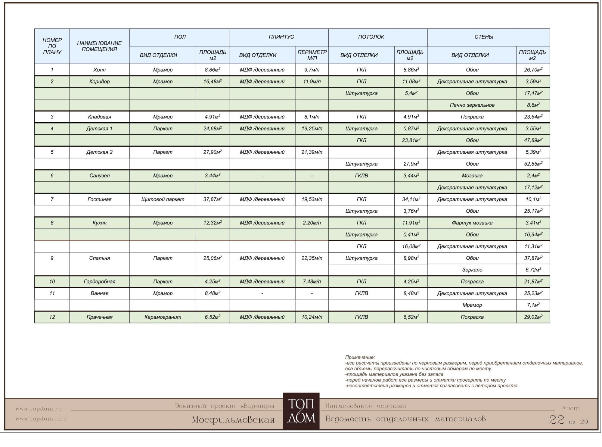 - Ведомость отделочных материалов (площадей и типов отделочных материалов по всем помещениям)