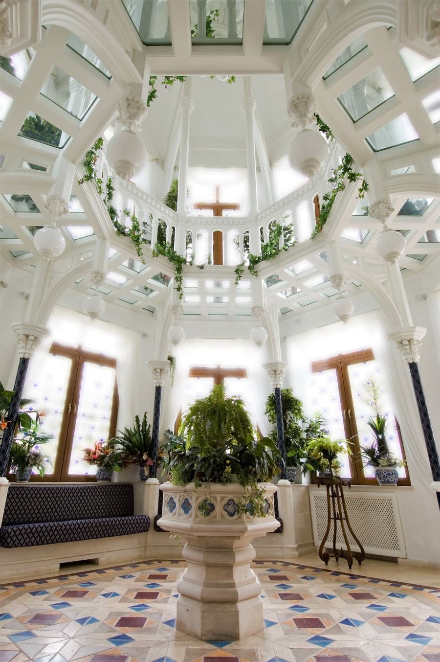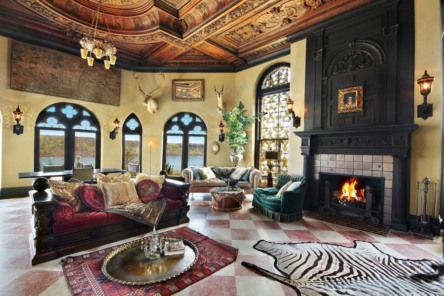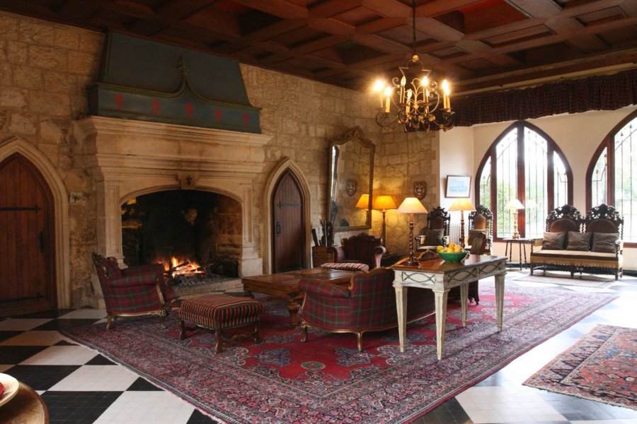 Аксессуары в виде каменных и кованых подставок для цветов, светильники с фигурами грифонов наполняют превосходные замковые интерьеры духом старины и истории. Теплая песочная палитра, множество живых растений, витражные вставки и мозаика помогают создать домашний уют.