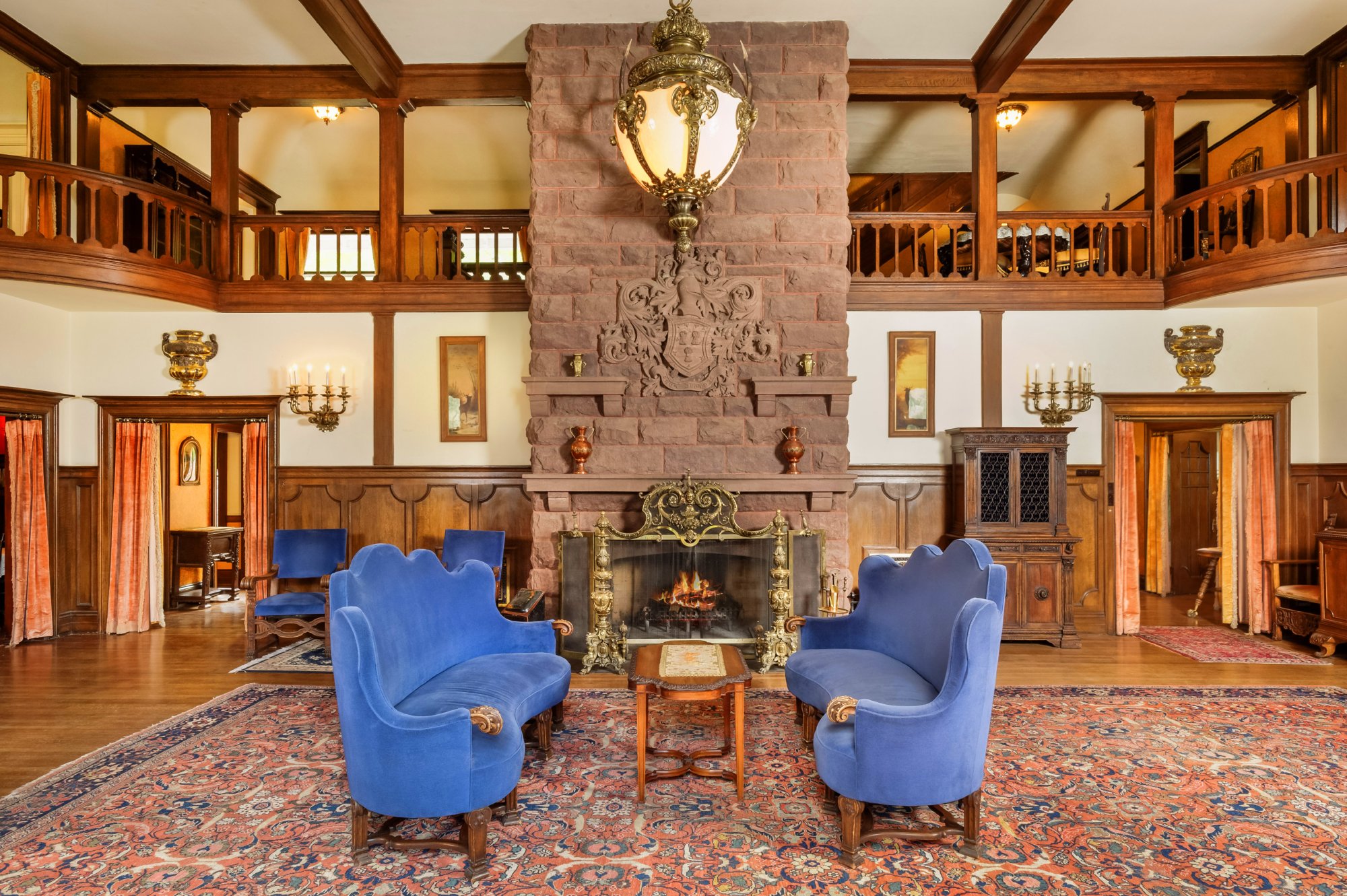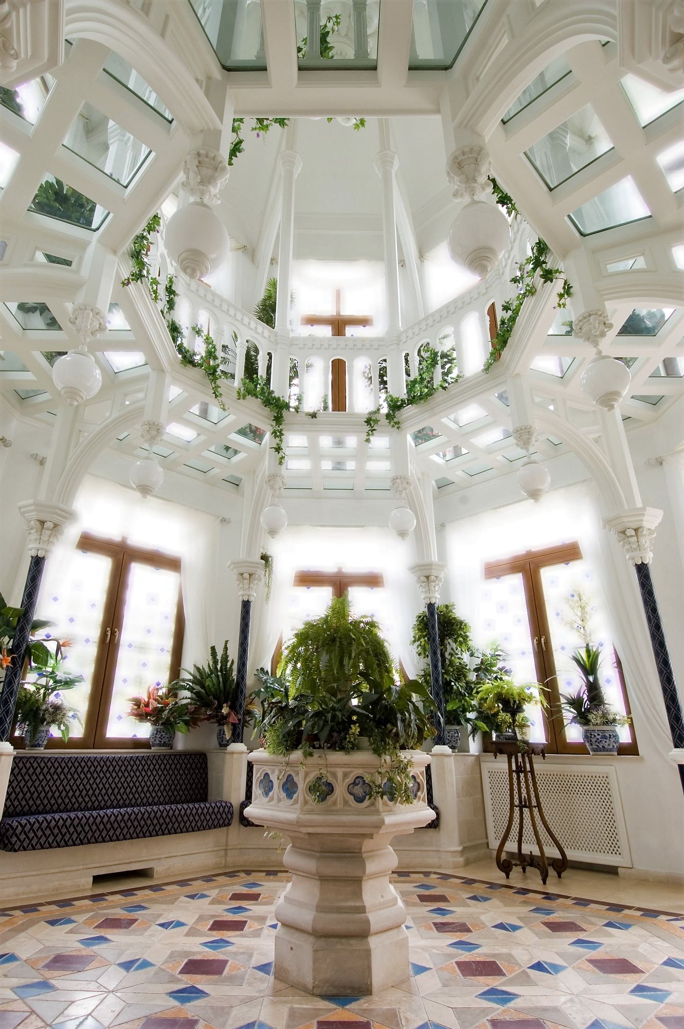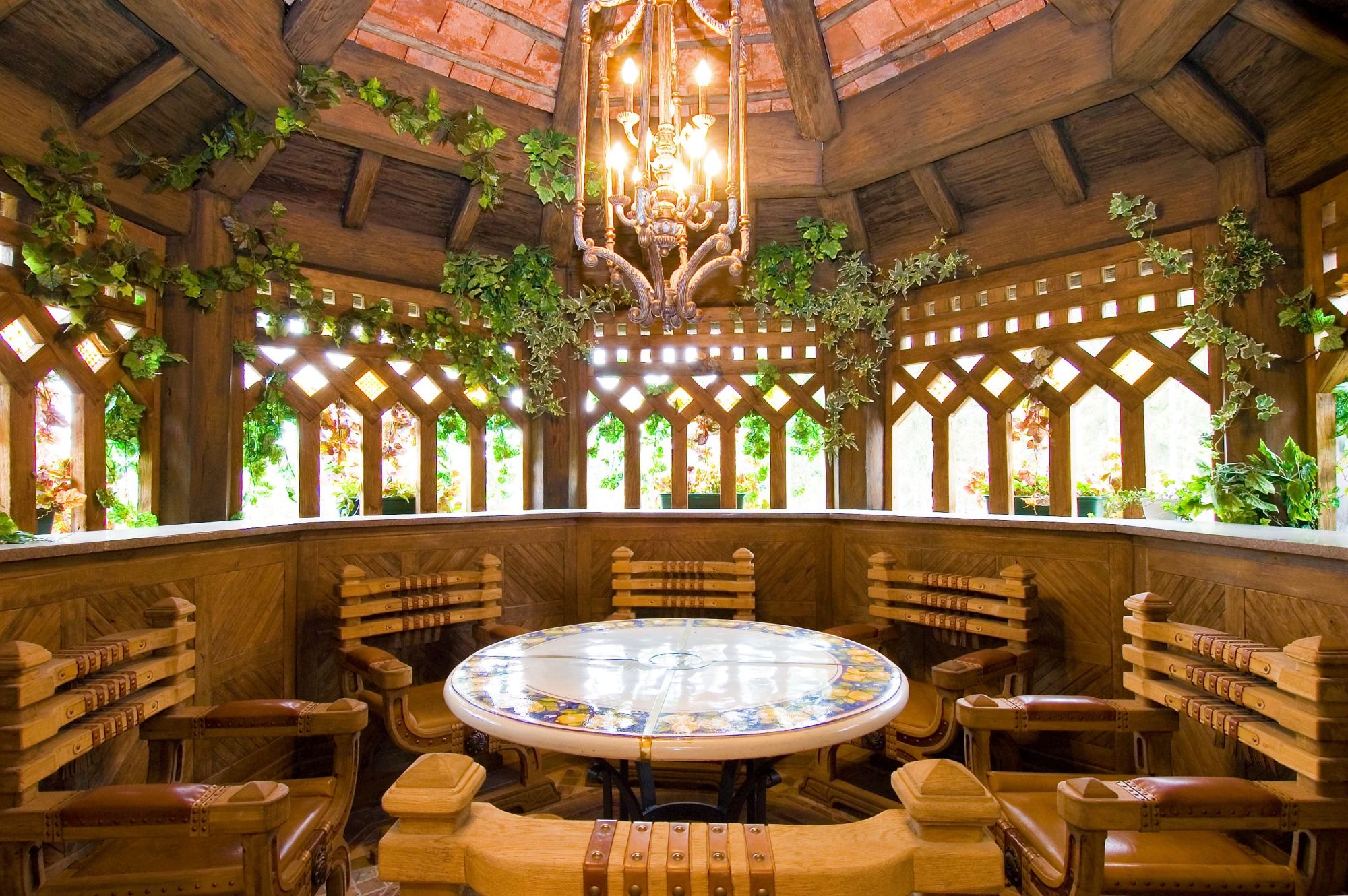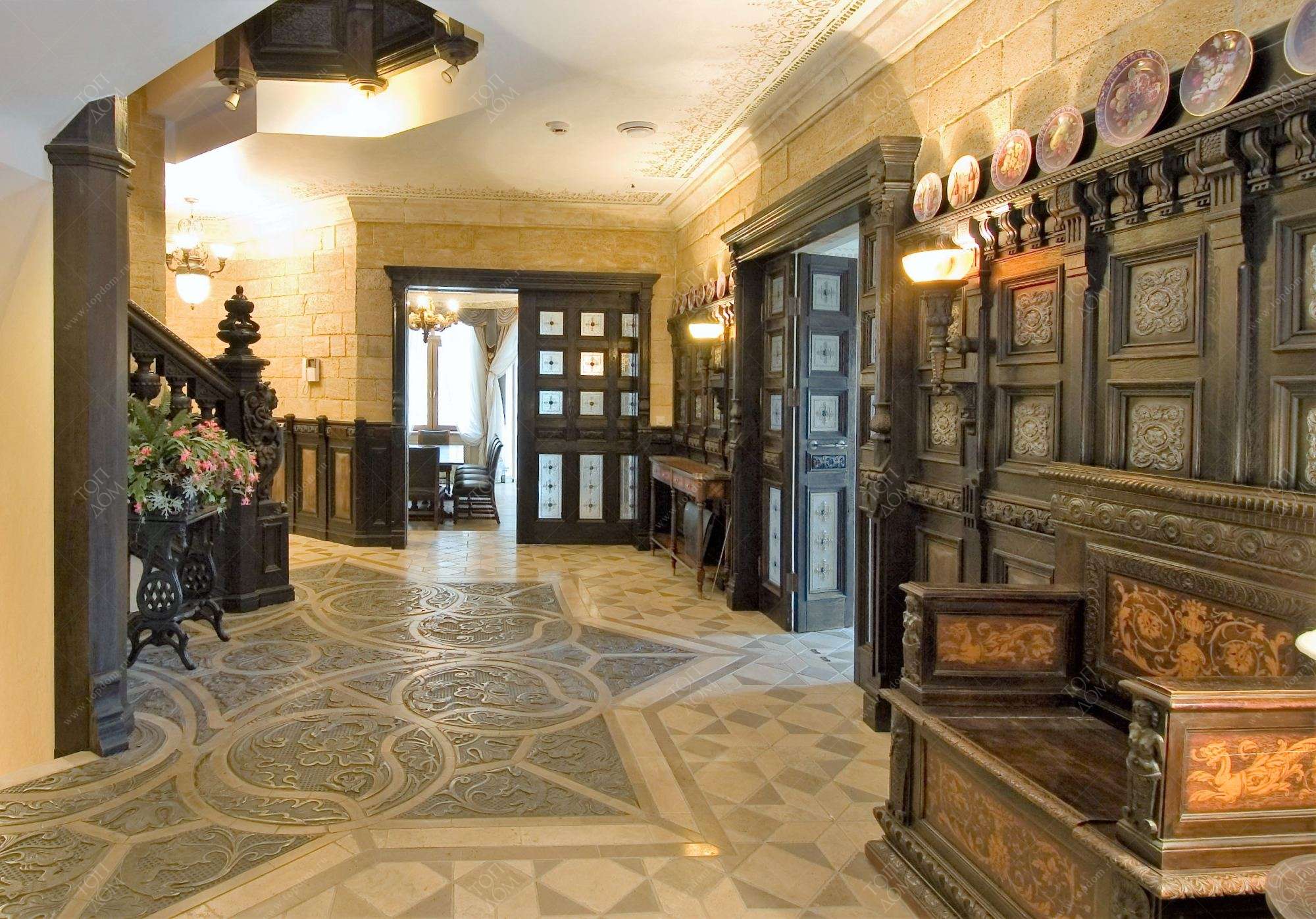 Особое внимание уделено декору помещений. Деревянные настенные панели щедро украшены резным орнаментом, росписью, инкрустацией. Как и подобранные под стать эпохе тяжеловесные кресла, комоды, скамьи. В качестве акцента на полу холла выполнена рельефная вставка с флористическим рисунком.