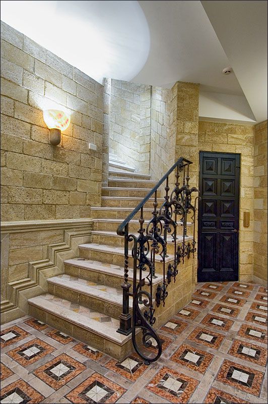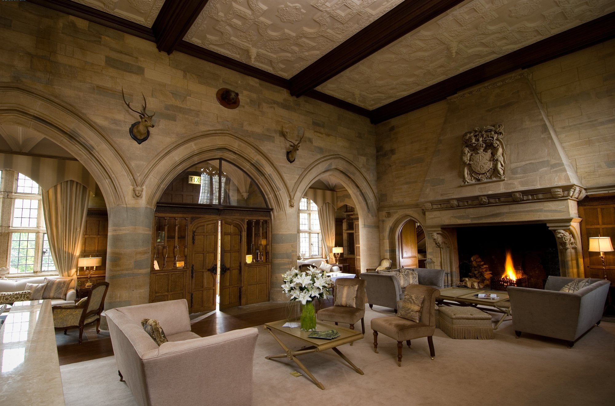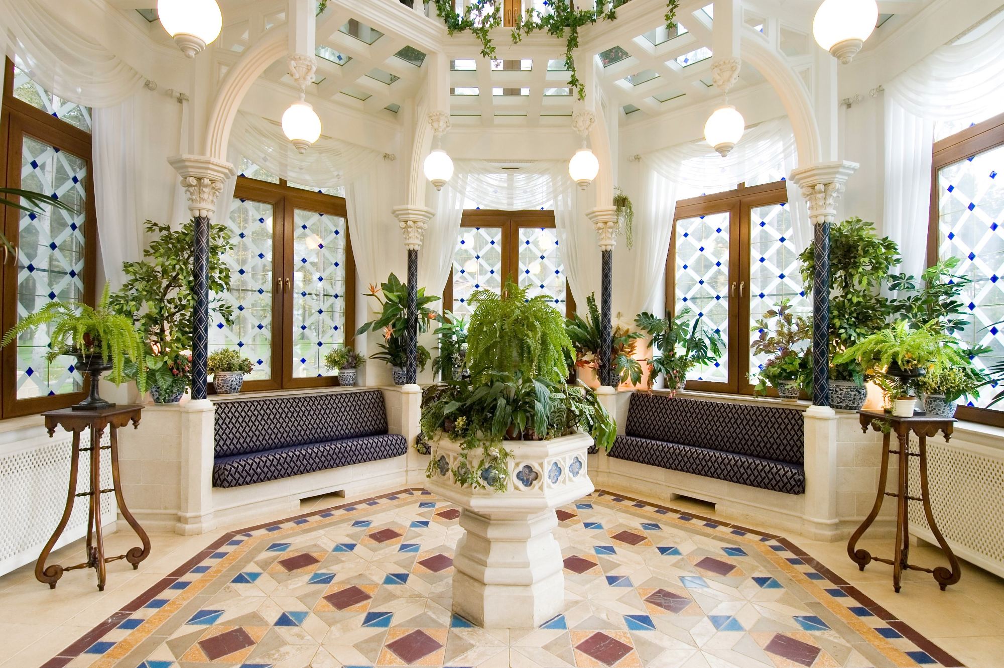Аксессуары в виде каменных и кованых подставок для цветов, светильники с фигурами грифонов наполняют превосходные замковые интерьеры духом старины и истории. Теплая песочная палитра, множество живых растений, витражные вставки и мозаика помогают создать домашний уют.