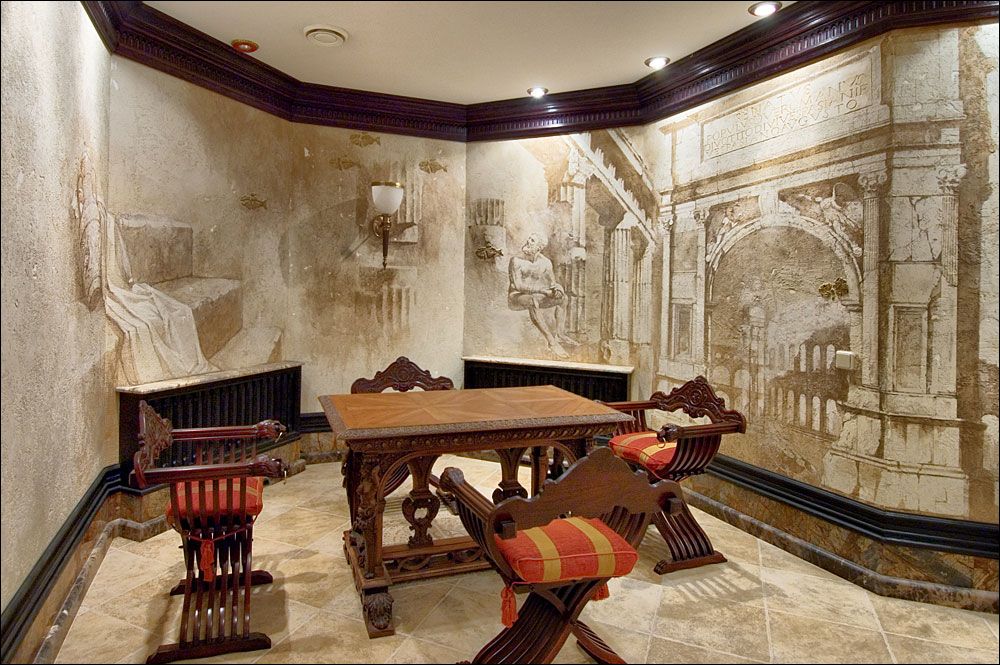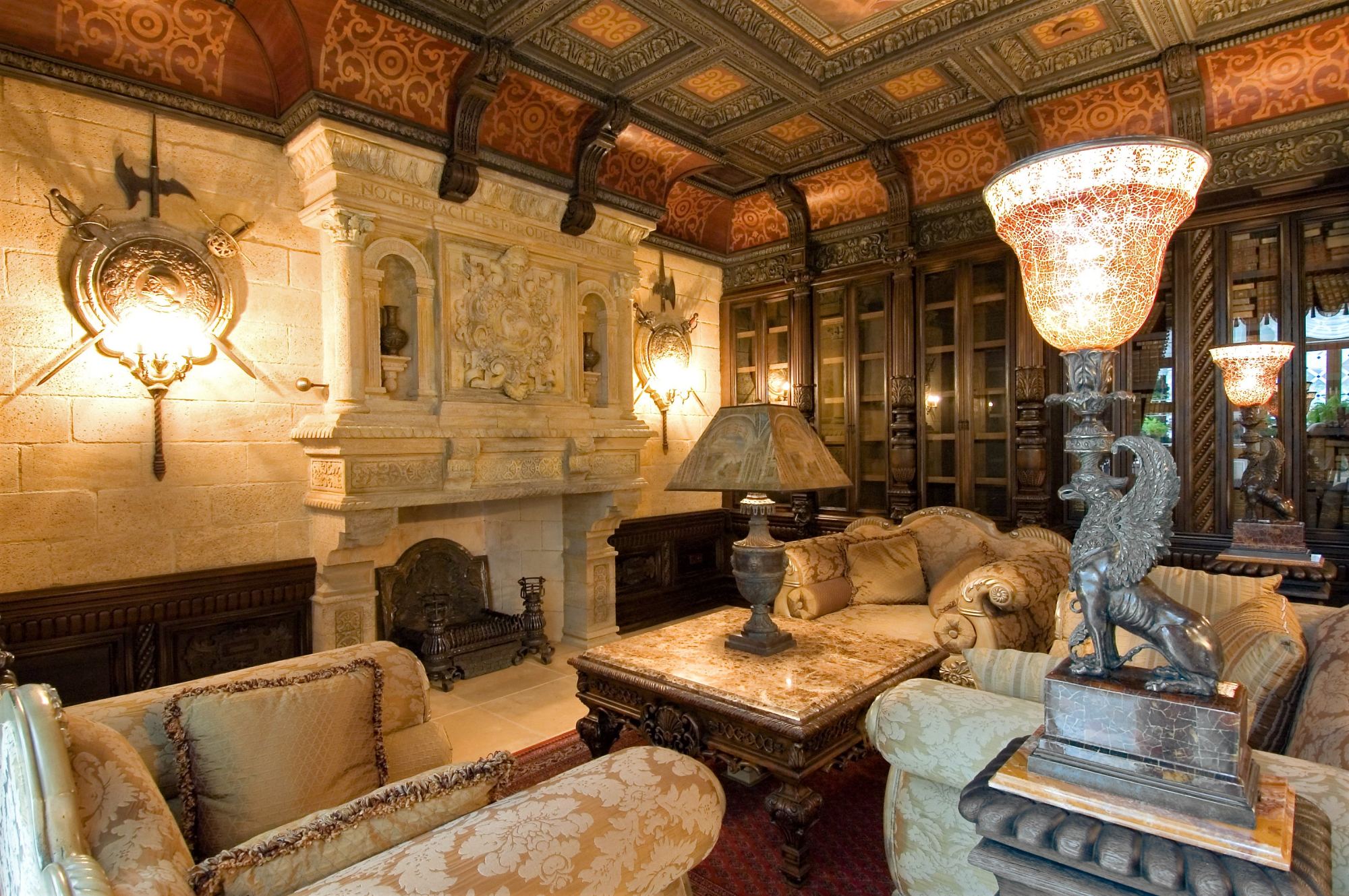 - В роскошном дизайне гостиной реализована классическая симметрия. Диванную группу образуют массивные пышные кресла, расставленные вокруг мраморного журнального стола. Композиционным центром выступает камин с мощным каменным порталом и античной резьбой. Стены облицованы ракушечником с подчеркнутой пористой структурой, в комбинации с темными дубовыми панелями отделка создает полное ощущение замковых покоев. Натуральный светлый оттенок камня перекликается с кремовой обивкой кресел и плитами на полу. Встроенные книжные шкафы оформлены резными колоннами и фризами, их конструкция переходит в кессонный потолок с инкрустацией и росписью.