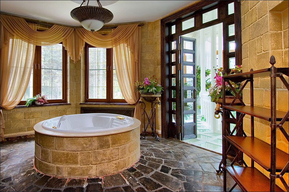 - Просторная ванная комната вымощена грубым серым камнем, выложенным вокруг купели. Намеренно неровные швы смотрятся колоритно и создают эффект давно обжитого пространства. Легкие шторы песочного цвета красиво дополняют коричневые оконные профили и смягчают аскетичную обстановку.