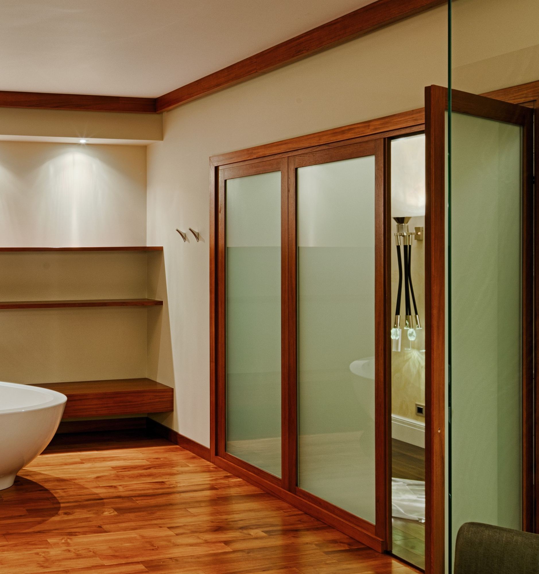 Ванная комната цвета слоновой кости с дверями в матированном остеклении