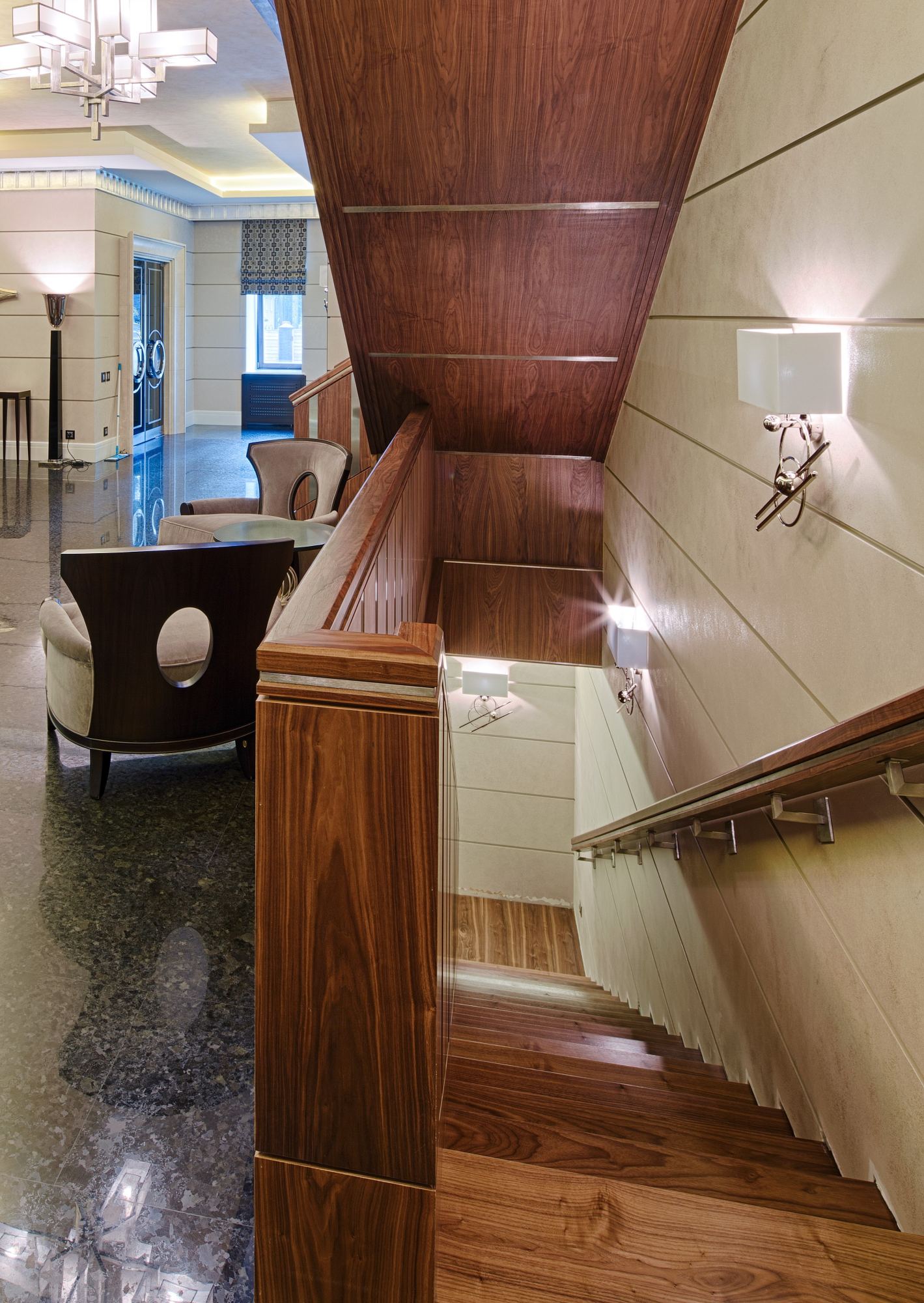 Белые настенные светильник в дизайн-проекте лестничного пролета