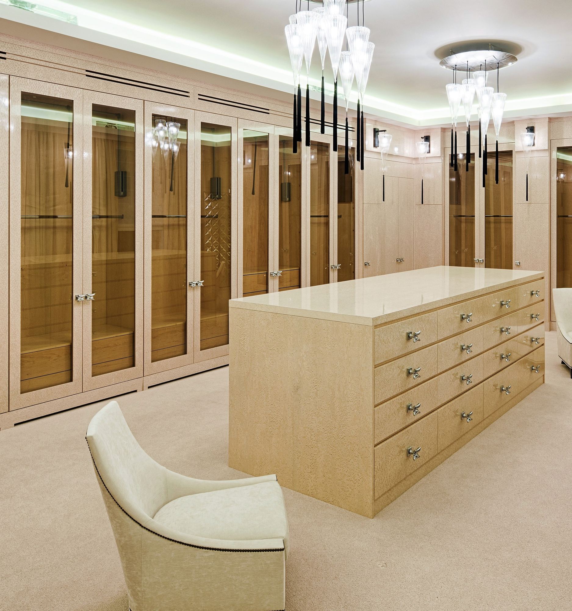 Интерьер гардероба с застекленными встроенными шкафами и островным комодом