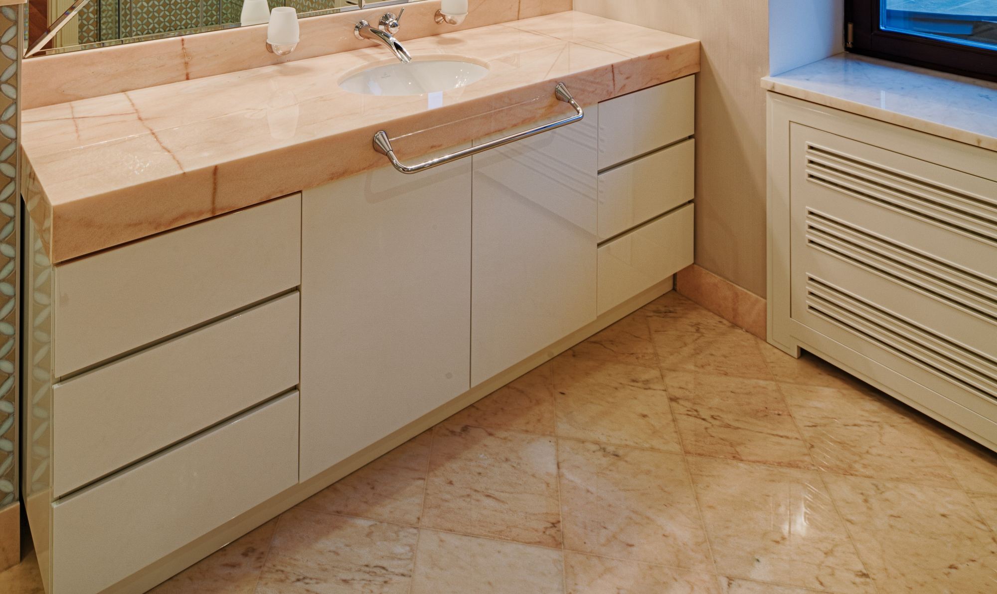 Розовый и кремовый мрамор в оформлении ванной комнаты