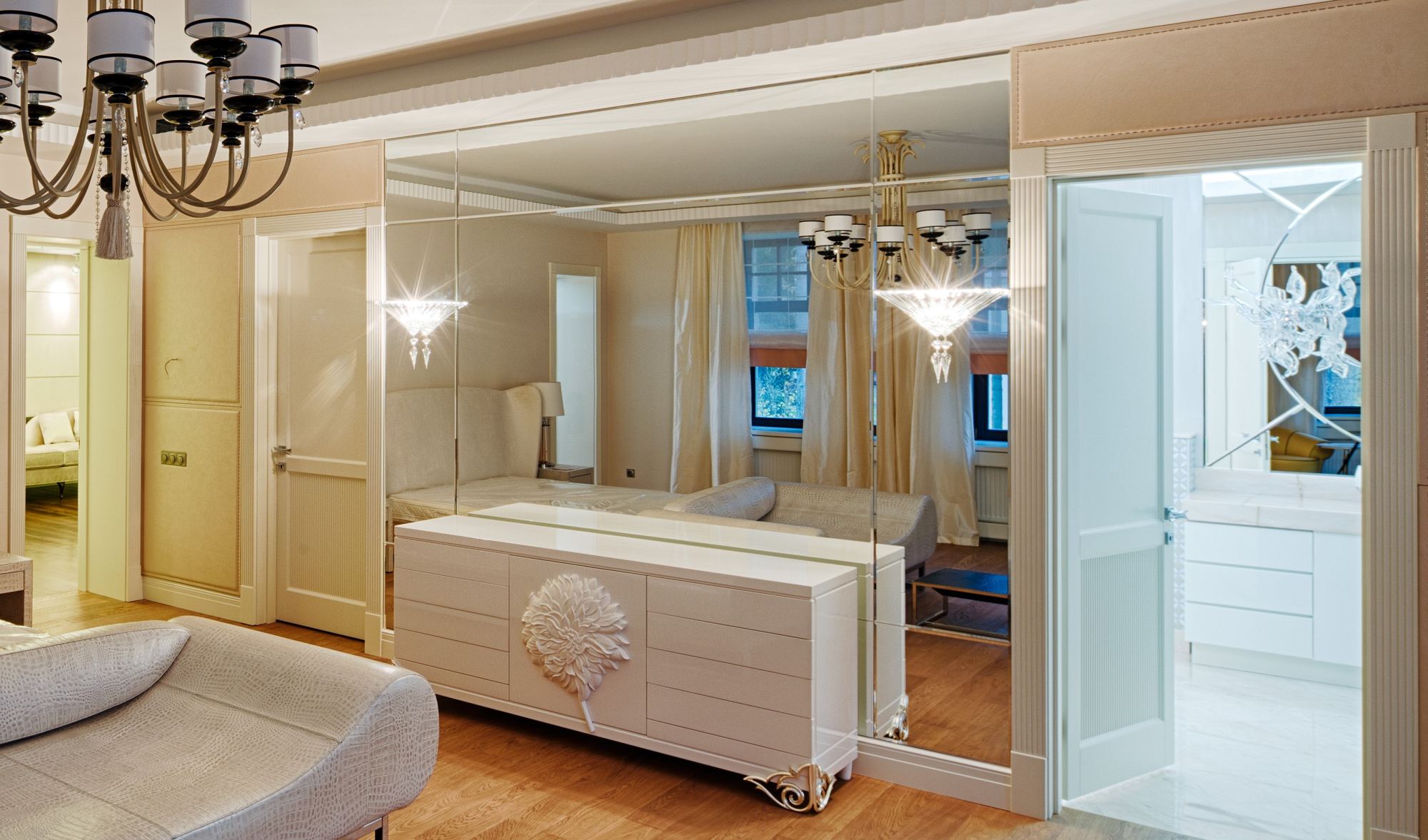 Зеркальная стена и белый комод в интерьере спальни цвета слоновой кости