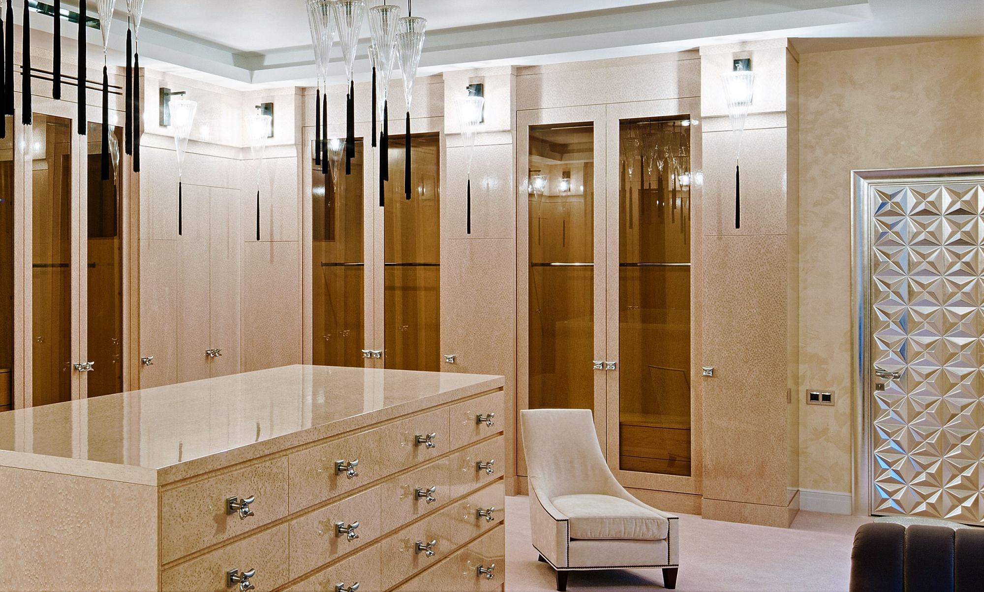 Гардеробная комната кремового оттенка с декорированной серебристой дверью