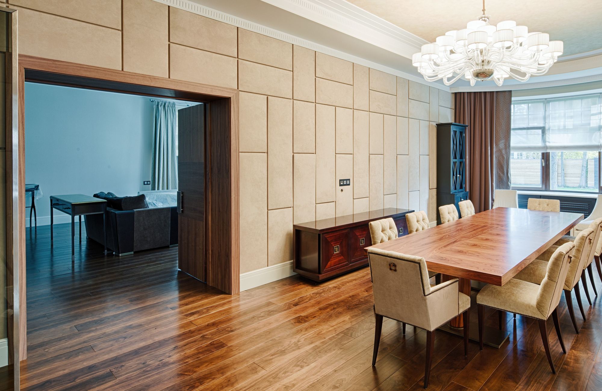 Столовая в пастельных тонах с буфетом цвета красного дерева