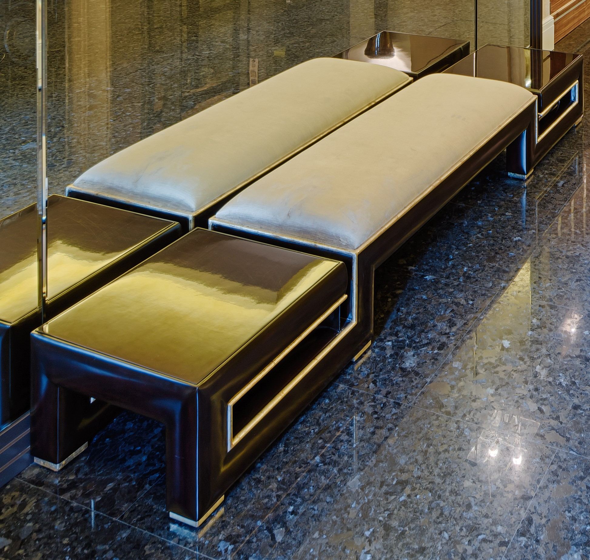 Банкетка в кожаной обивке с серебристым сиденьем в интерьере прихожей