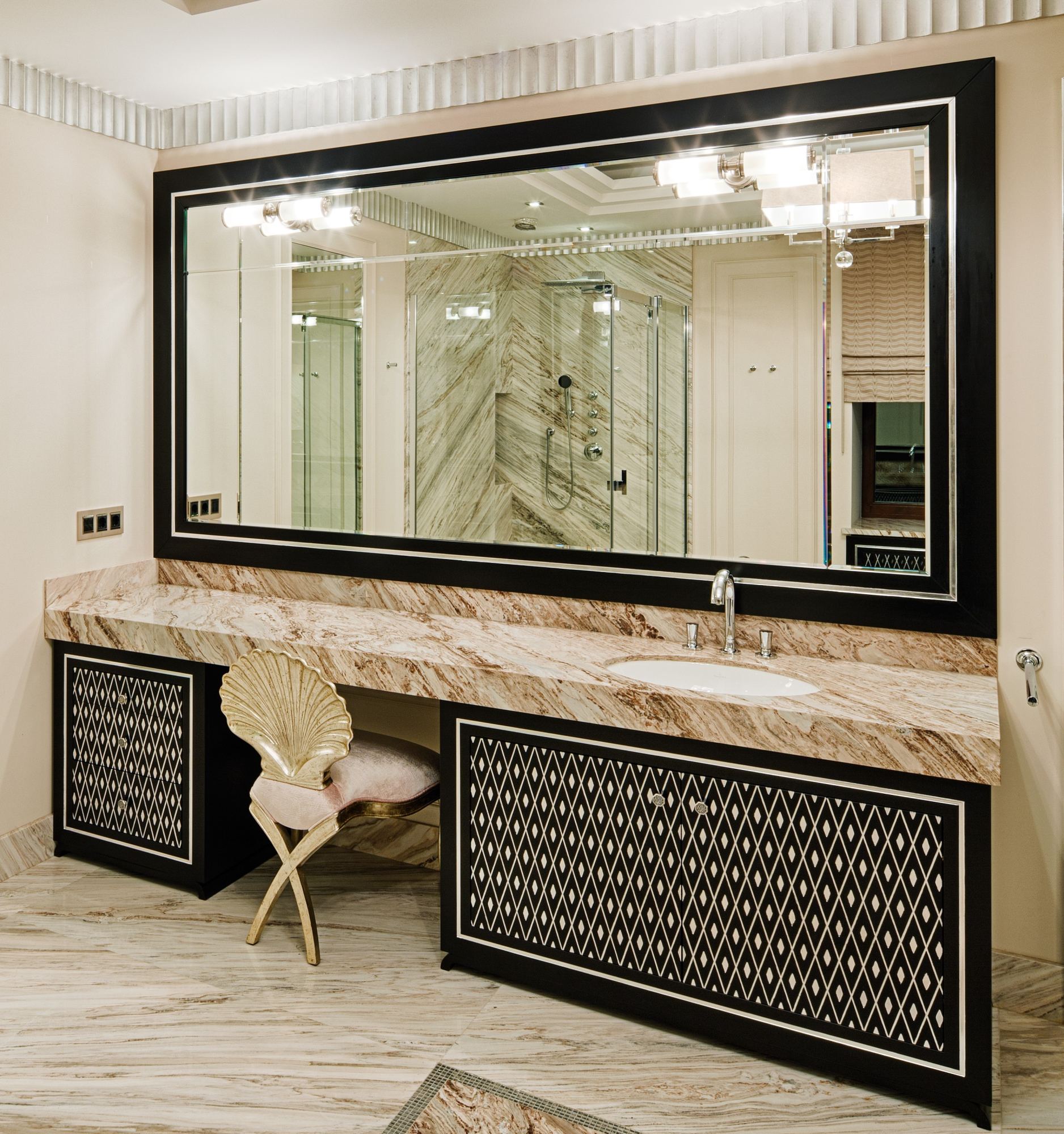 Черные тумбы и зеркало в интерьере санузла бежево персикового оттенка