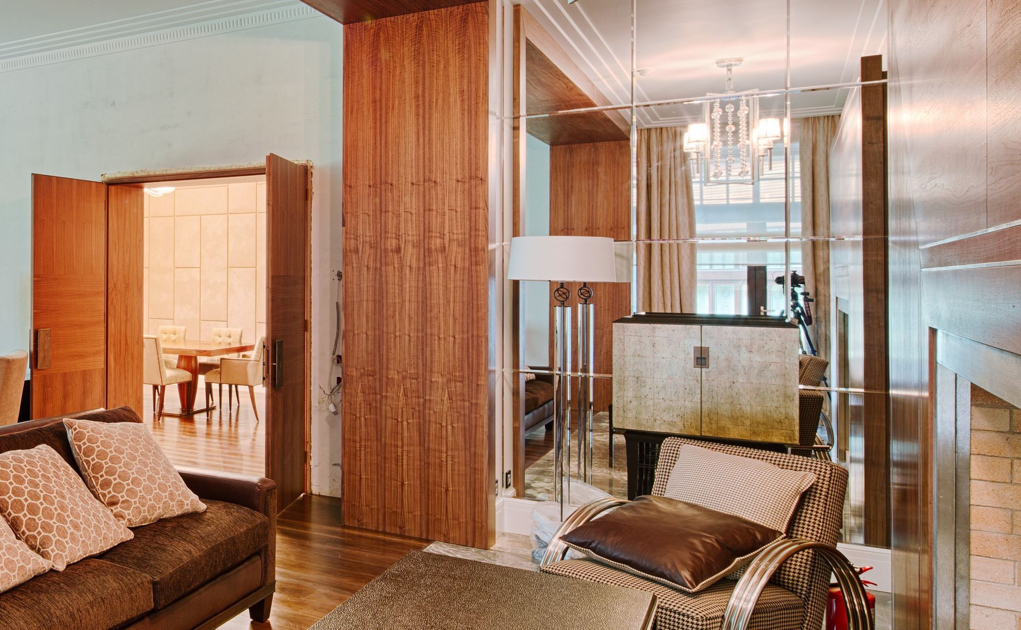 Стена в отделке квадратными зеркалами с фацетом в дизайн-проекте каминной зоны
