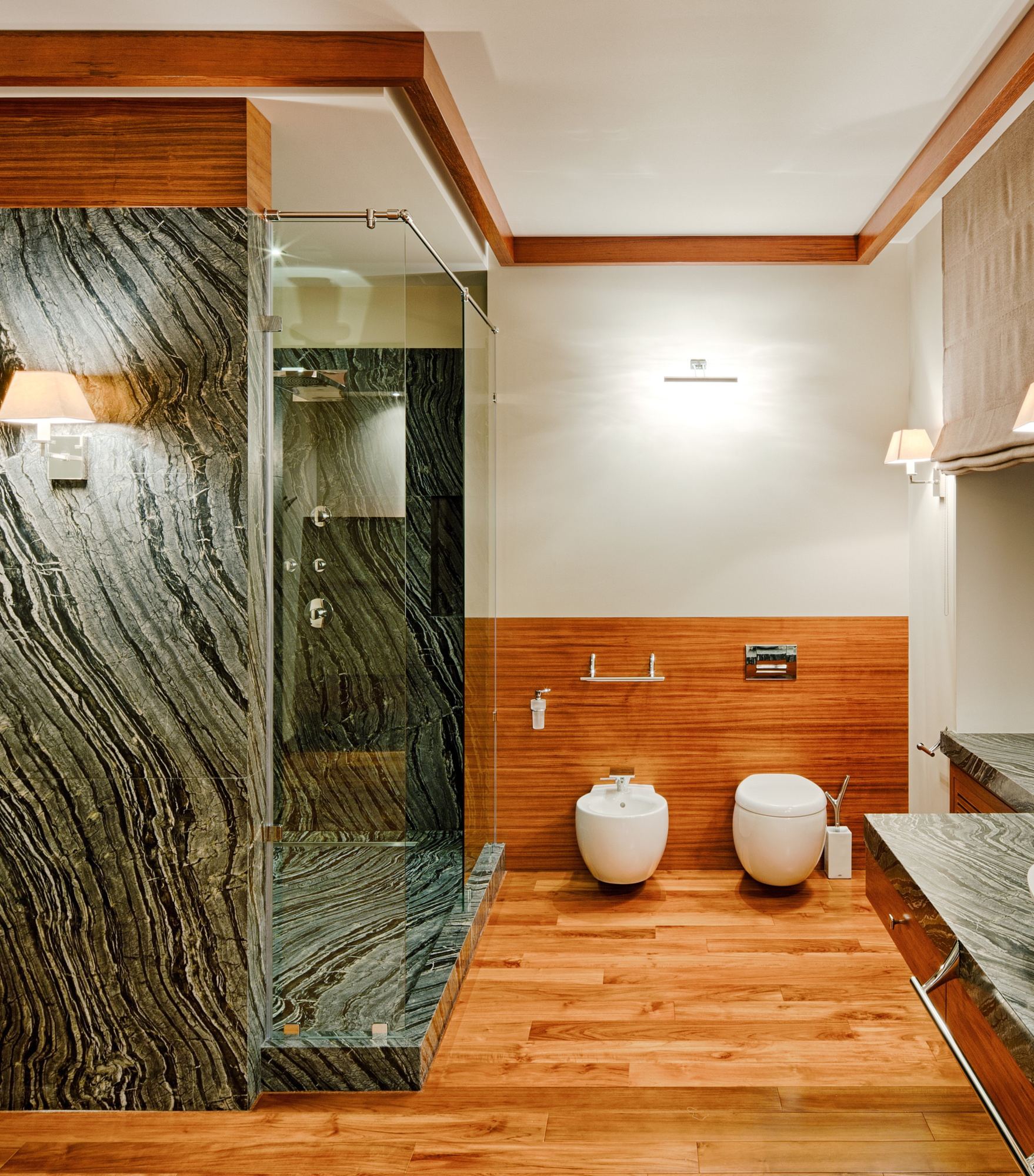 Душевая кабина из зеленого мрамора в дизайн-проекте санузла