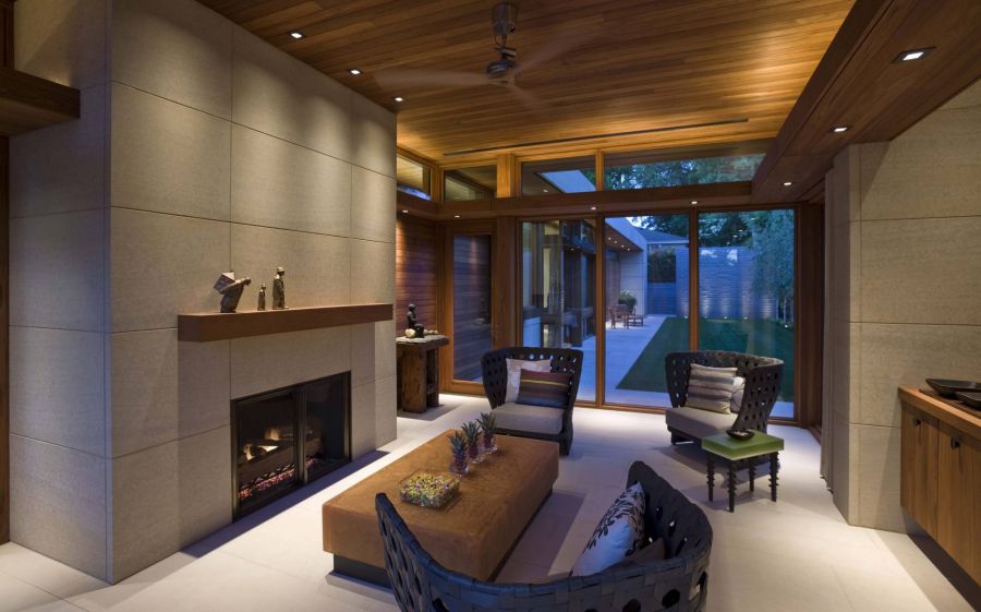 Не последнюю роль играет грамотное решение экстерьера, созвучное оформлению комнат. Как в проекте дизайна частного дома, где уличная терраса органично дополняет открытые внутренние пространства, обрамленные панорамными окнами и раздвижными перегородками.