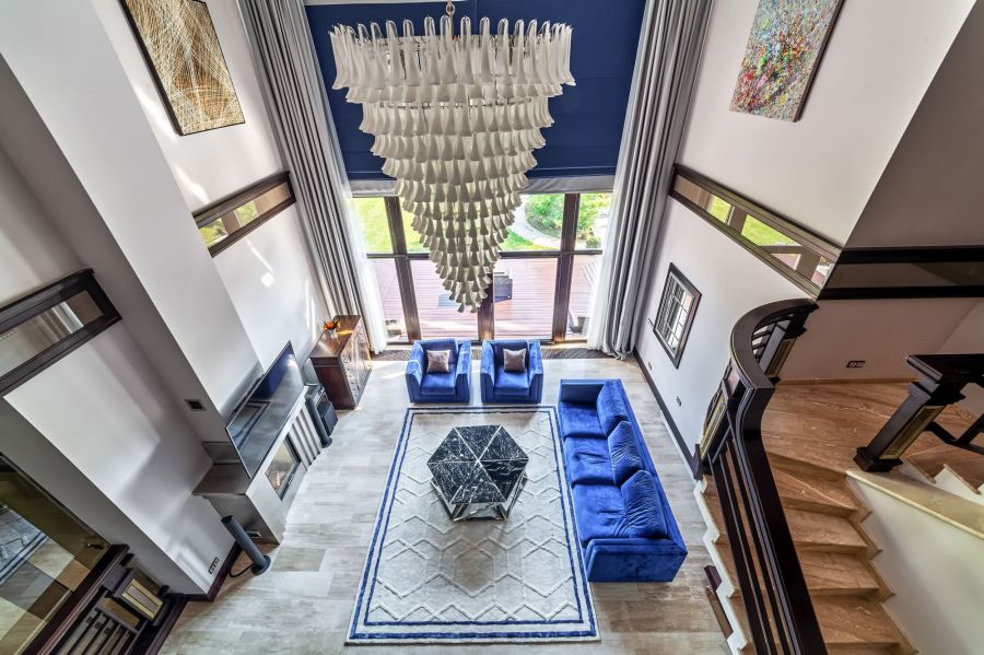 В реализованном проекте красивого ремонта в частном доме этот прием органично фокусирует жилое пространство вокруг зоны отдыха, очерчивая контуры с помощью деревянной балюстрады на первом и втором этажах. Каскадная люстра направляет внимание на ярко-синюю диванную группу и футуристический журнальный столик.