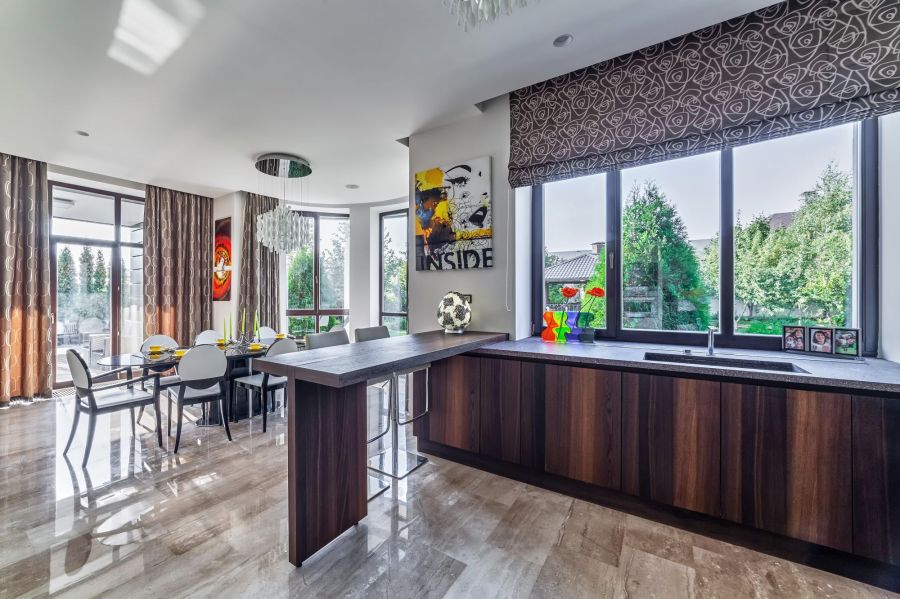 Планировка кухонной зоны интересна использованием ниши, куда встроены гарнитур и часть рабочих поверхностей. Остров, совмещенный с барной стойкой, вынесен в центр помещения и выделен на полу белой мраморной плиткой. Самостоятельная обеденная группа с круглым столом располагается у окна, откуда можно любоваться природой.