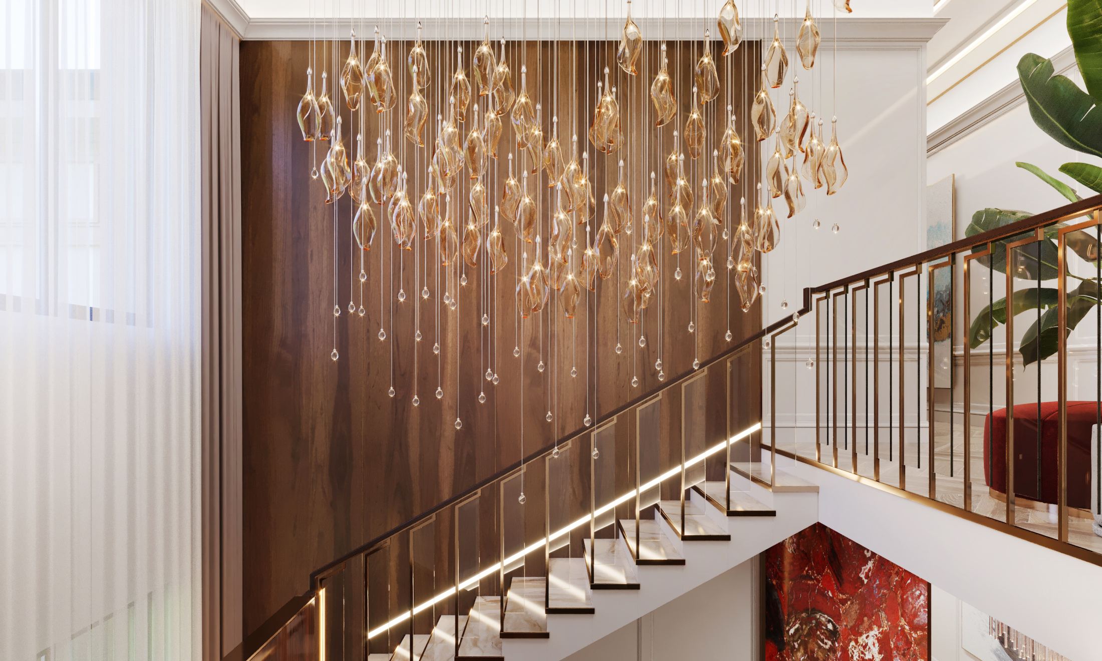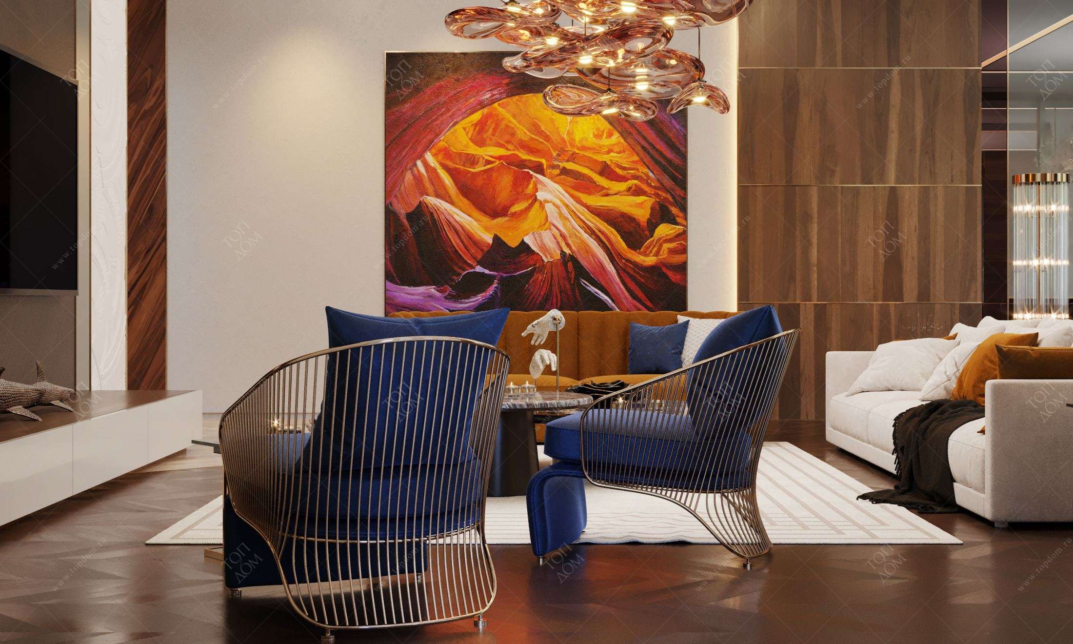 В реализованном проекте красивого ремонта в частном доме этот прием органично фокусирует жилое пространство вокруг зоны отдыха, очерчивая контуры с помощью деревянной балюстрады на первом и втором этажах. Каскадная люстра направляет внимание на ярко-синюю диванную группу и футуристический журнальный столик.