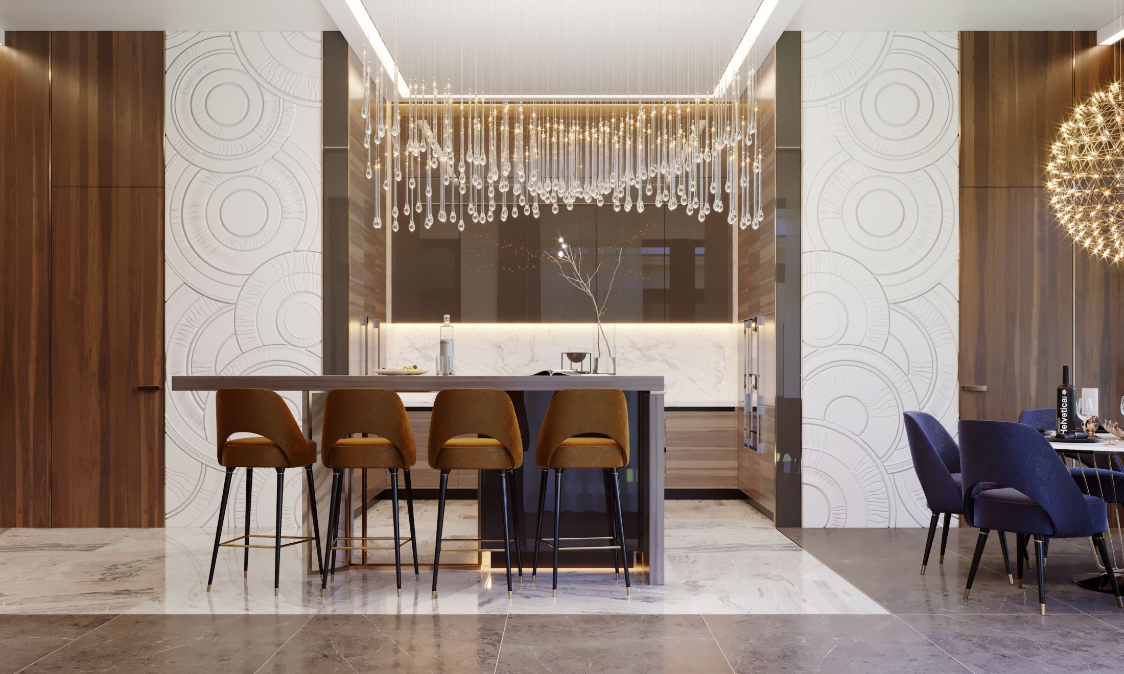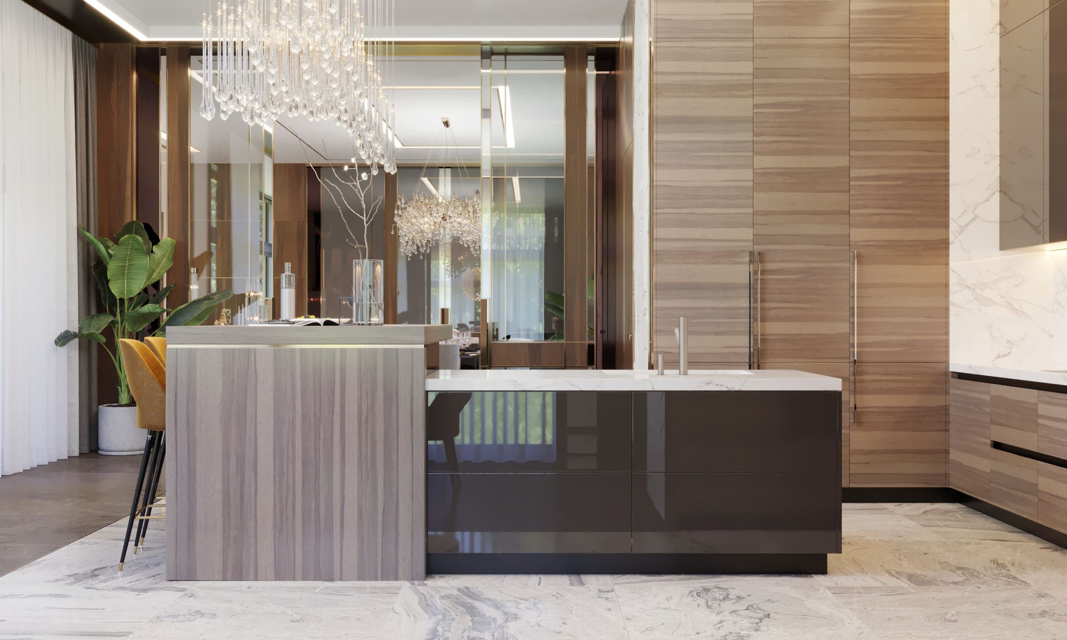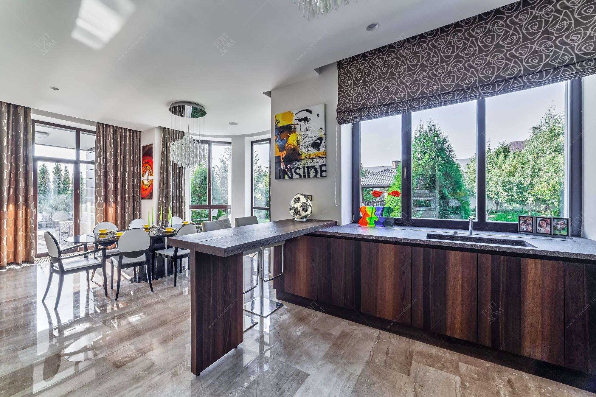 Планировка кухонной зоны интересна использованием ниши, куда встроены гарнитур и часть рабочих поверхностей. Остров, совмещенный с барной стойкой, вынесен в центр помещения и выделен на полу белой мраморной плиткой. Самостоятельная обеденная группа с круглым столом располагается у окна, откуда можно любоваться природой.