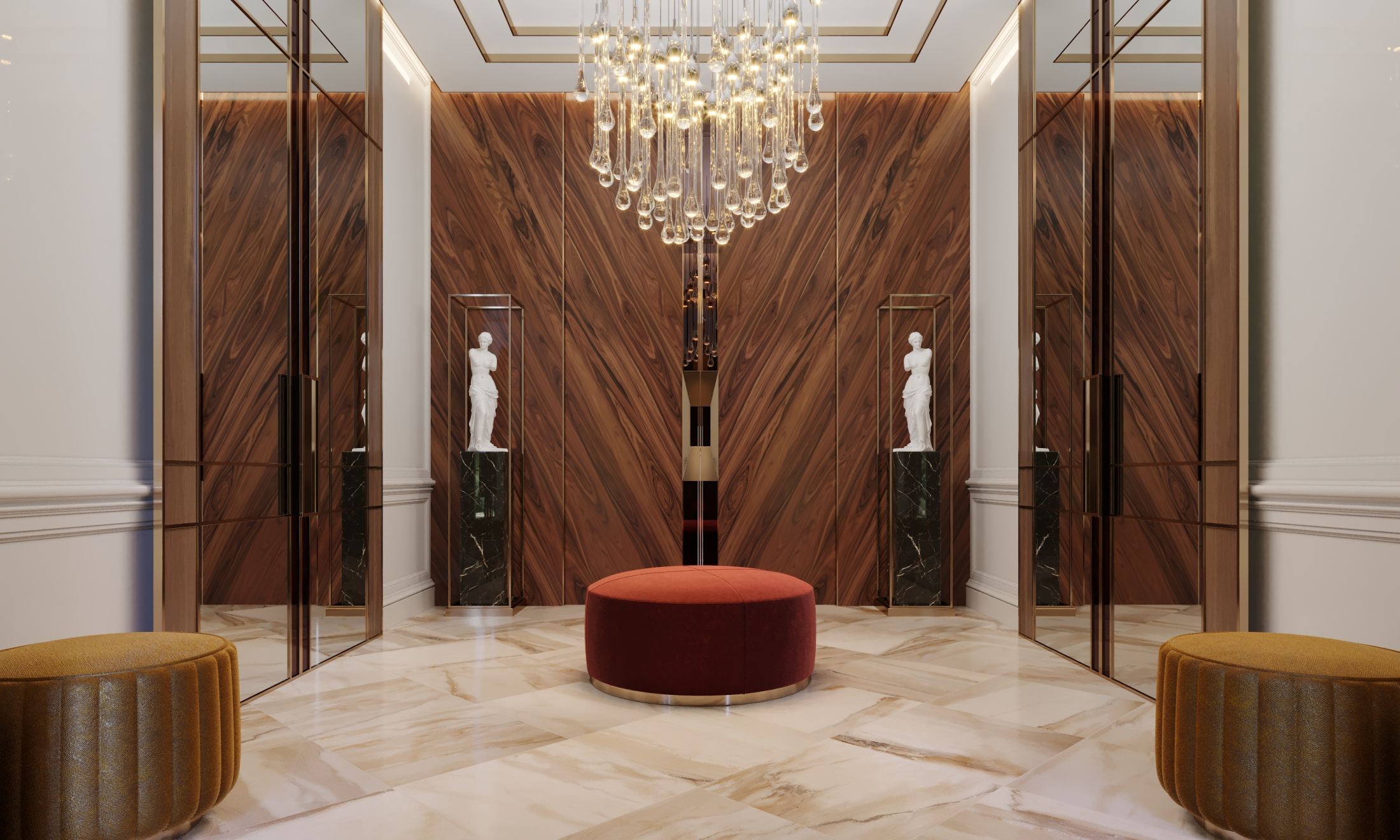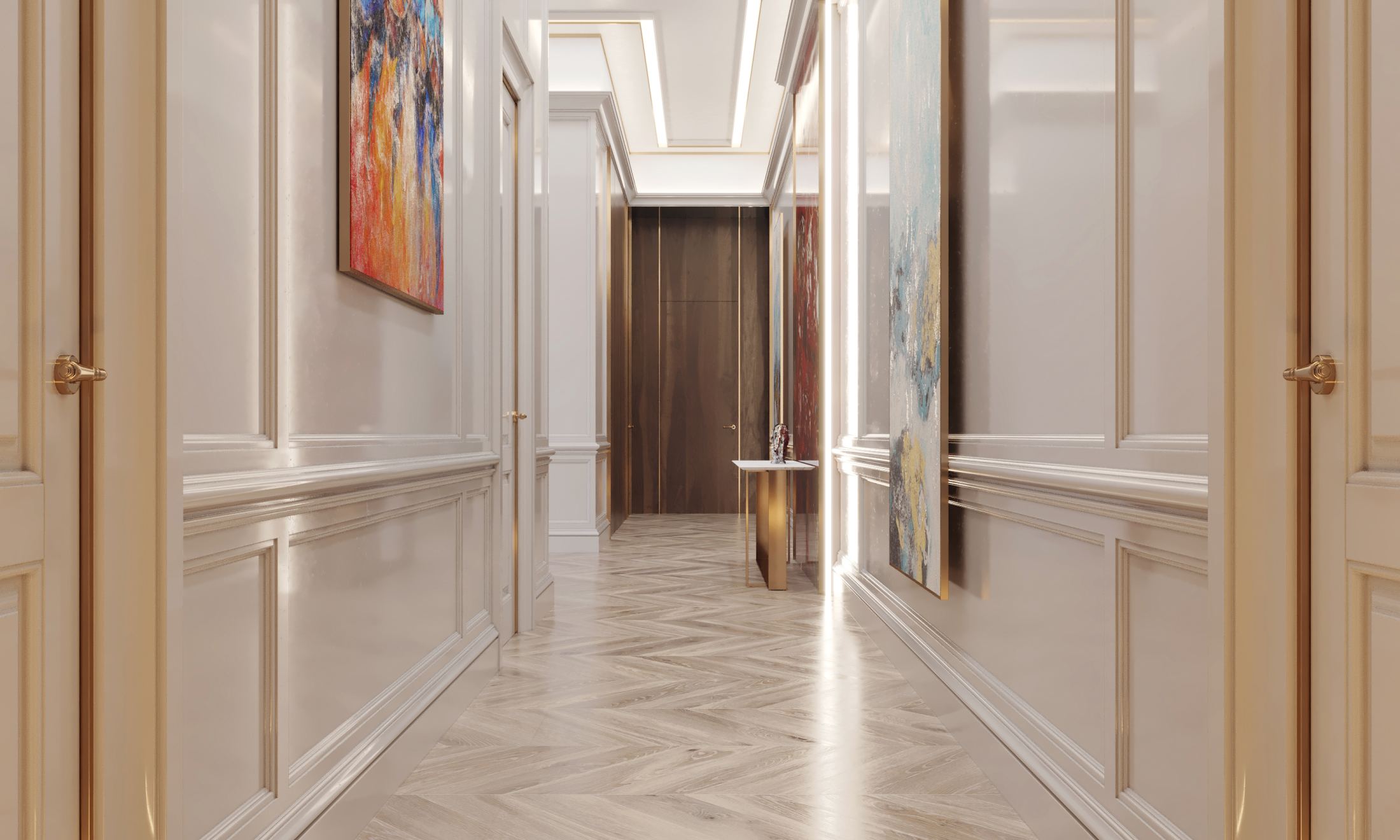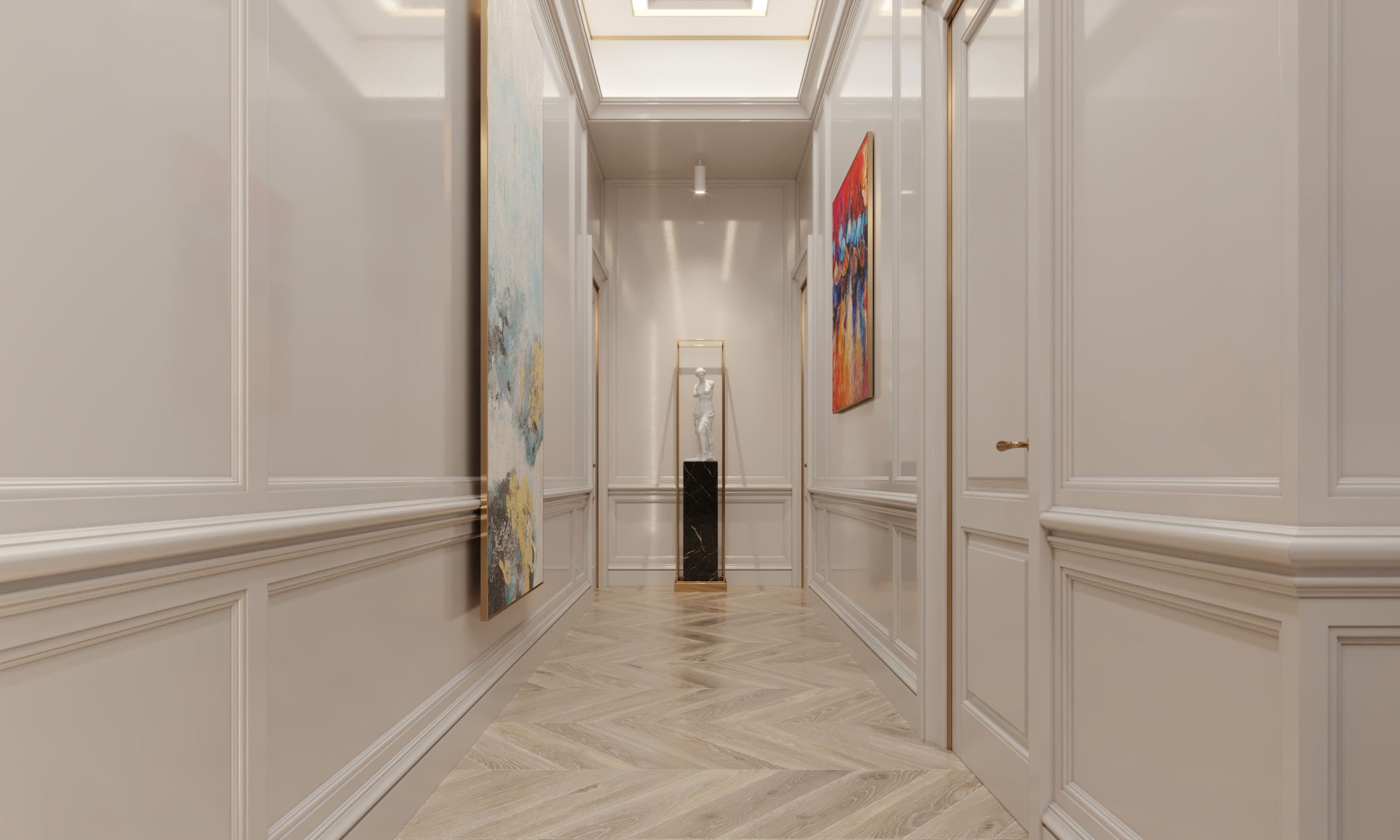 - светло-бежевый мрамор прихожей зрительно перетекает в такой же по тональности паркет холла и гостиной;