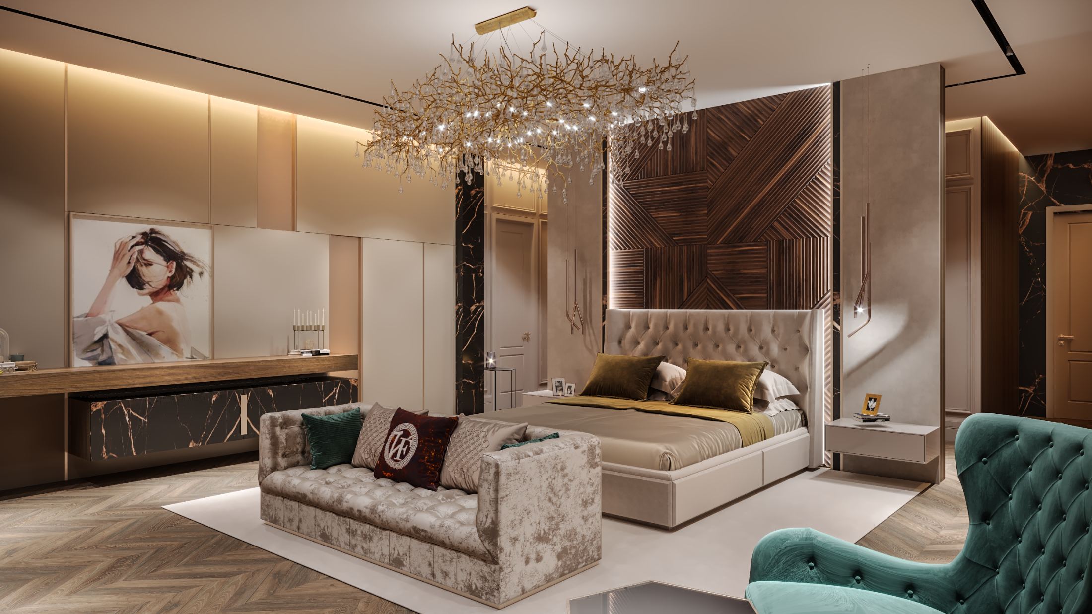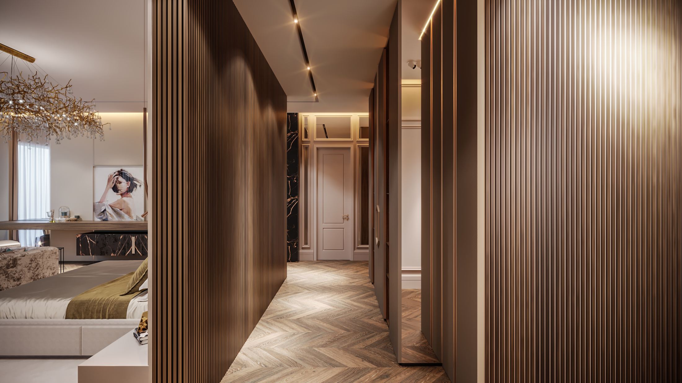 Большая спальня получила удобную организацию пространства за счет декоративной перегородки, которая отделяет спальное место от гардеробного шкафа и прохода в ванную комнату.